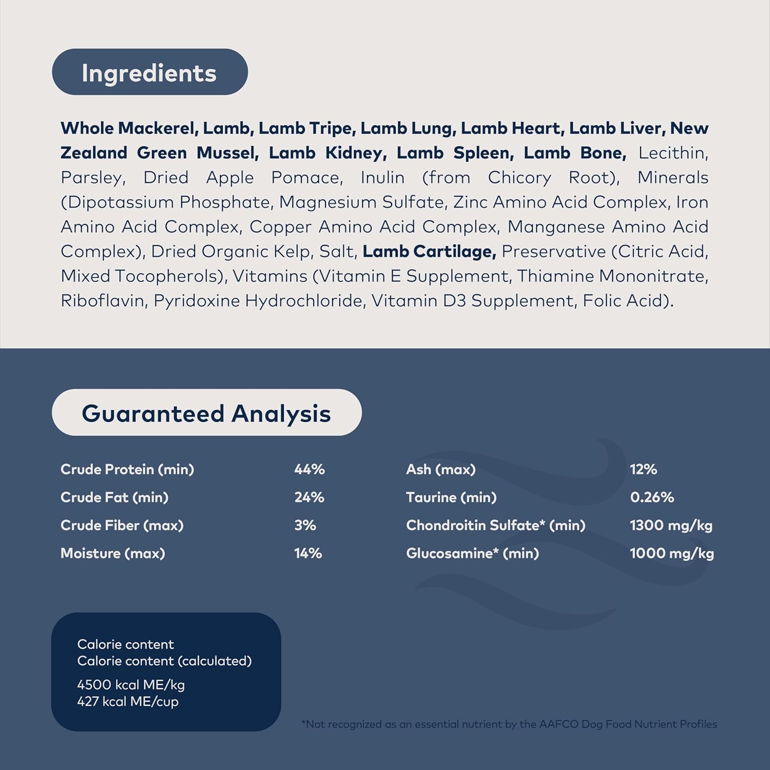 • HIGH PROTEIN, NUTRIENT DENSE: Featuring wild-caught Mackerel and free-range Lamb, Organs, Bone, and New Zealand Green Mussels, this grain-free dog food delivers nutrition with a mouth-watering taste for all dogs. Gentle air dried processing retains the goodness of the raw ingredients. This food offers stimulating crunchy texture small enough for puppy food but soft enough for senior dog food.