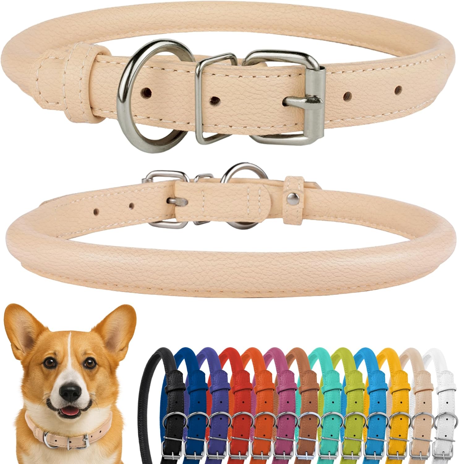CollarDirect Rolled Leather Dog Collar, Soft Padded Round Puppy Collar, Handmade Genuine Leather Collar Dog Small Large Cat Collars 13 Colors (11-14 Inch, Beige Textured)