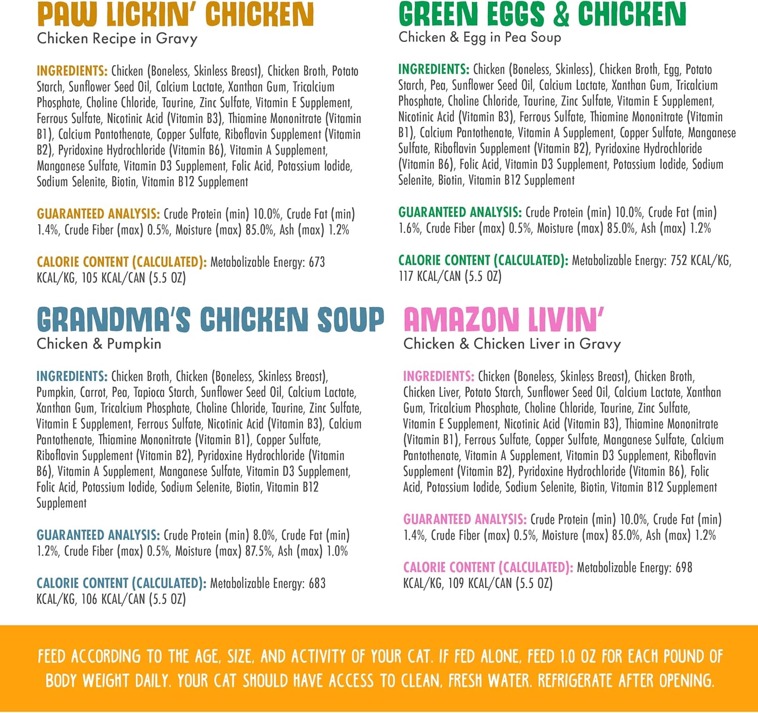 - Variey Pack includes 6 cans of each: Paw Lickin’ Chicken, Green Eggs & Chicken, Grandma’s Chicken Soup and Nine Liver.