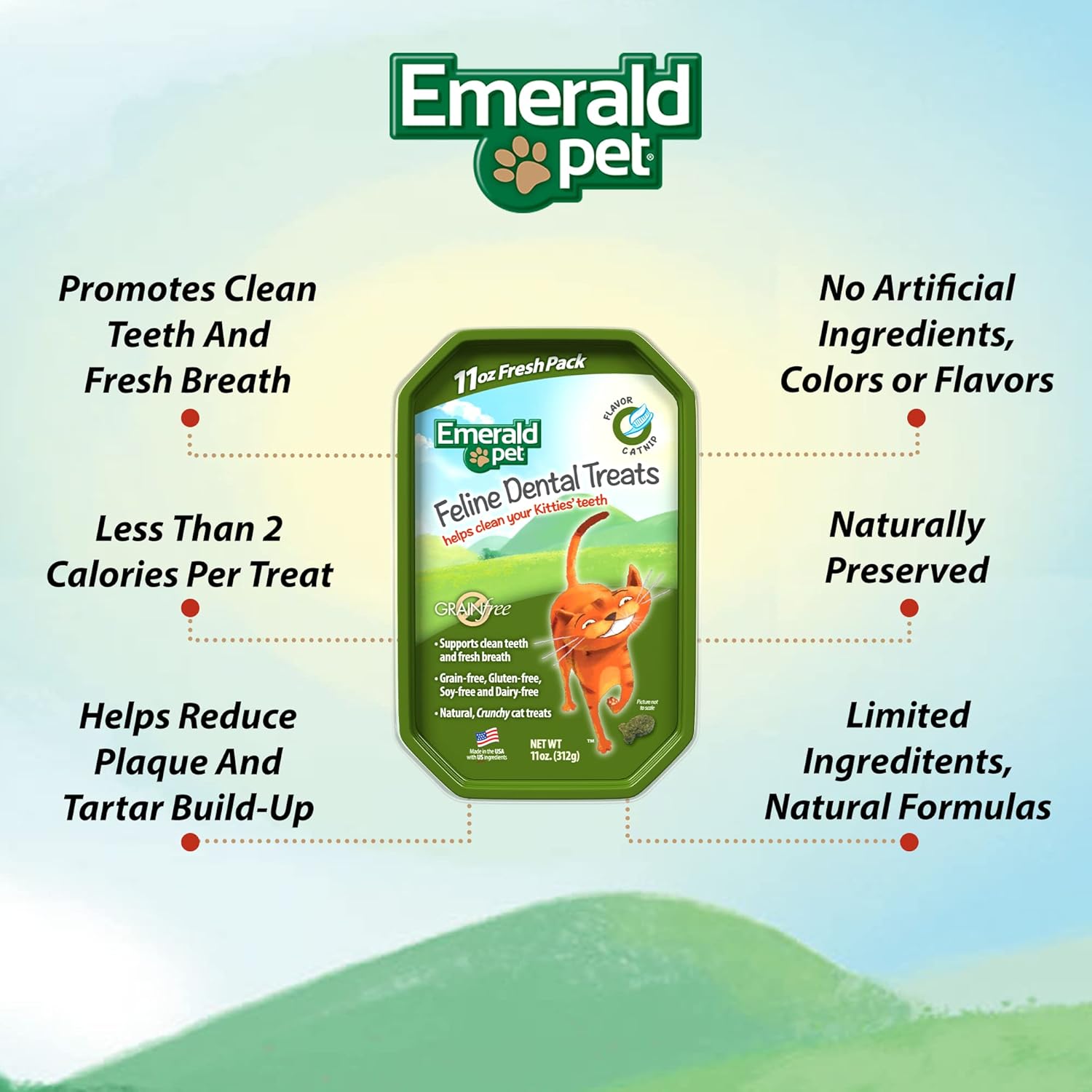 - NATURAL AND LIMITED INGREDIENTS THAT HELP CATS LIVE A HEALTHIER LIFE — Emerald Pet's grain free dental cat treats are made with natural and limited ingredients specializing in allergen concerns so cats can live a happy and healthy life with their pet owners. These healthy kitty treats contain no sugars, salt, or by-products but still taste amazing. All Emerald Pet products are made right here in the USA with premium US-sourced ingredients.
