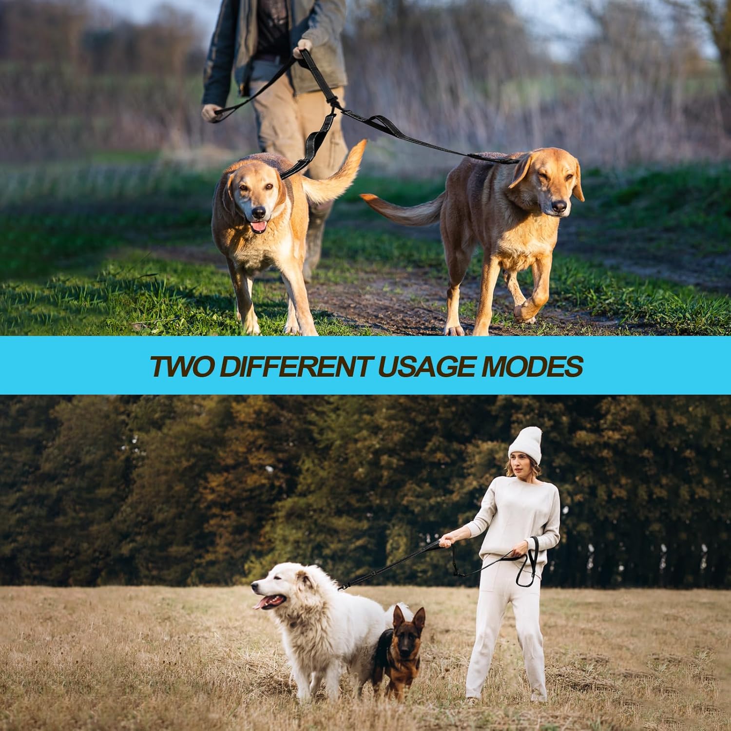 - 4 Comfortable Padded Handles: No more burned hands with 4 soft padded handles, which bring ultimate comfort and let you free up one hand while using this split leash for walking 2 dogs