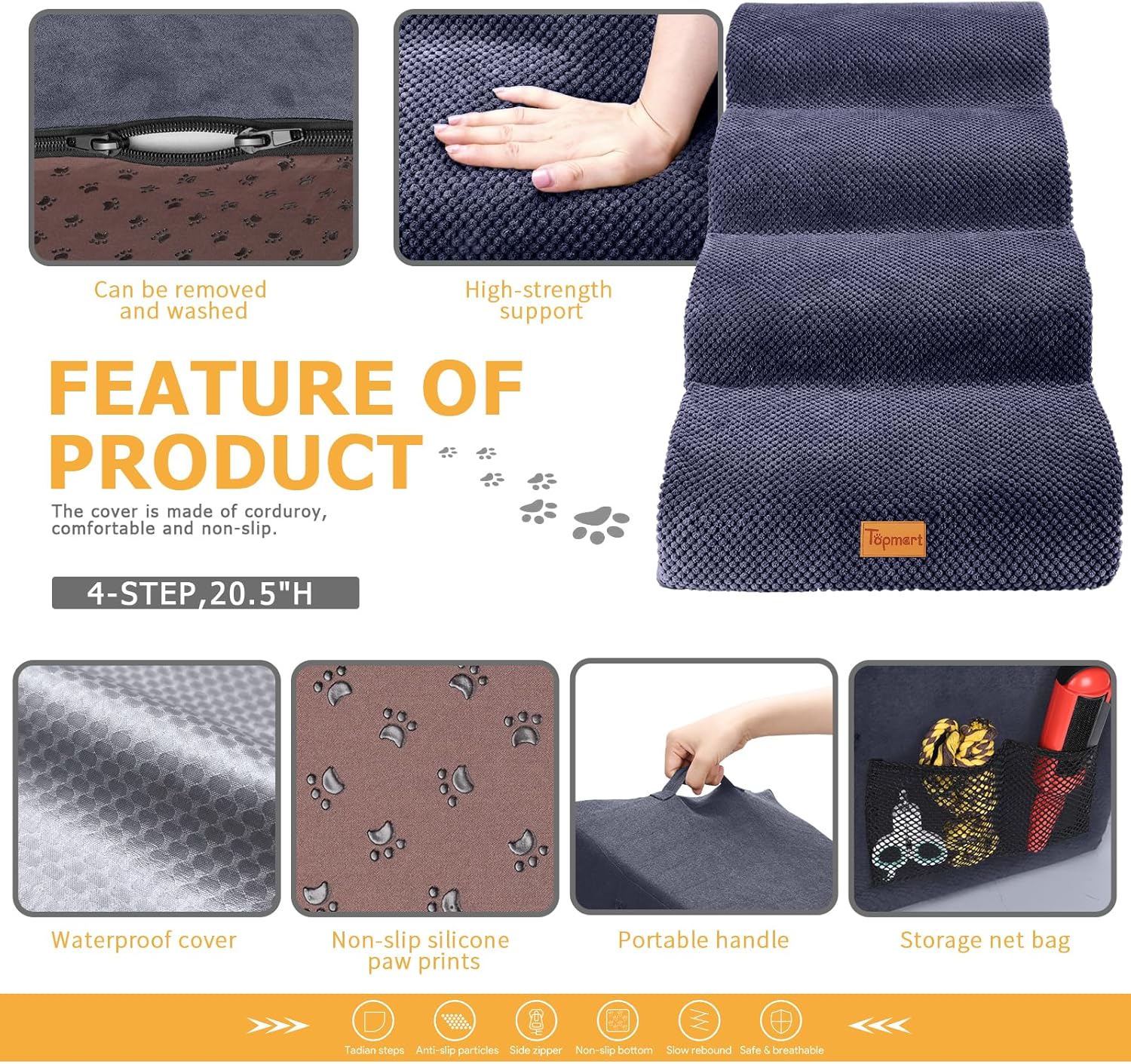 - Safer,Wider&Deeper Steps:Each step is 15.75in x 7.1in.Our dog stairs are excellent for those older dogs who are less mobile as they age or for cats with injuries. More wide and deep steps are helpful for reducing the strain that constantly jumping up and down onto bed,sofa or car can have on your pet's joints,and topmart dog steps will not shake and slip during use. The cover made of corduroy is more frictional than other covers, pets will not slip on the stairs.
