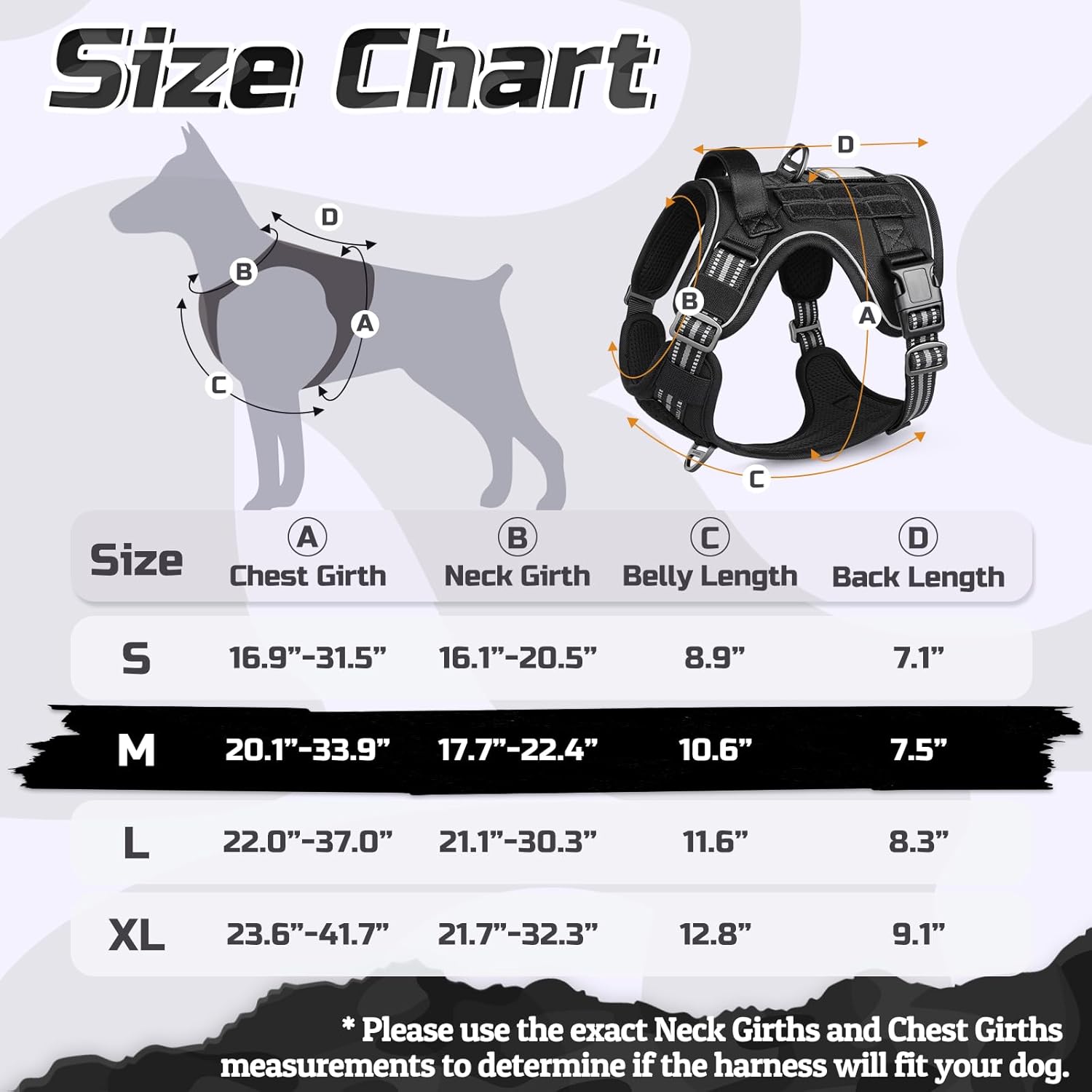 • Medium Tactical Dog Harness: Chest Girth: 20.1"-33.9" (51-86cm), Neck Girth: 17.7"-22.4" (45-57cm), Belly Length: 10.6" (27cm), Back Length: 7.5" (19cm). Ideal for Pitpull, Boxer, Cane Corso, Labradoodle, Australian Shepherd, Corgi, Bull Terrier, Cairn Terrier, etc