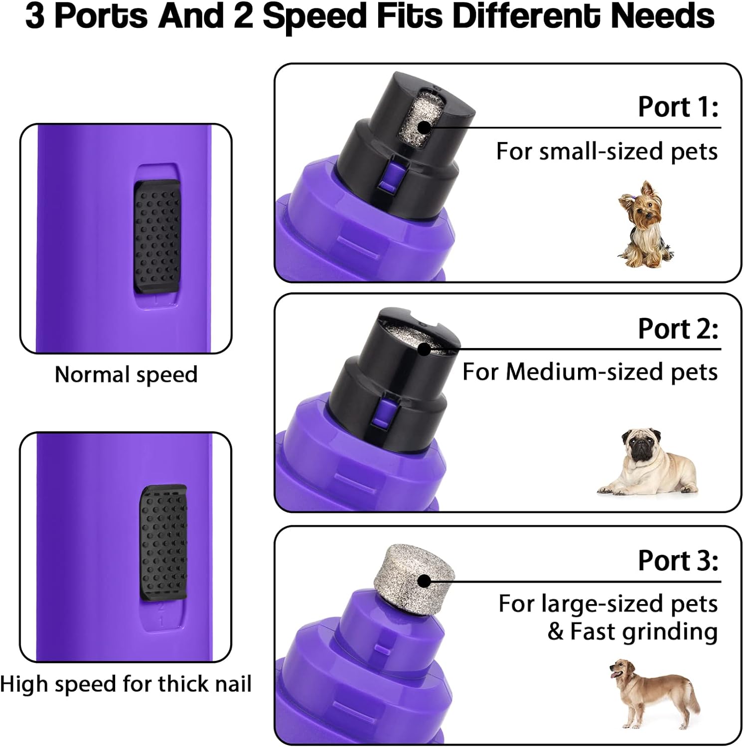 - Advanced 2-Speed Switch & 3 Grinding Ports: The trimmer features an adjustable, low-high speed design powerful enough support heavy grinding. And with 3 ports to match small, medium, or large pets, simply choose the appropriate port and speed depending on your pet's size and nail hardness.