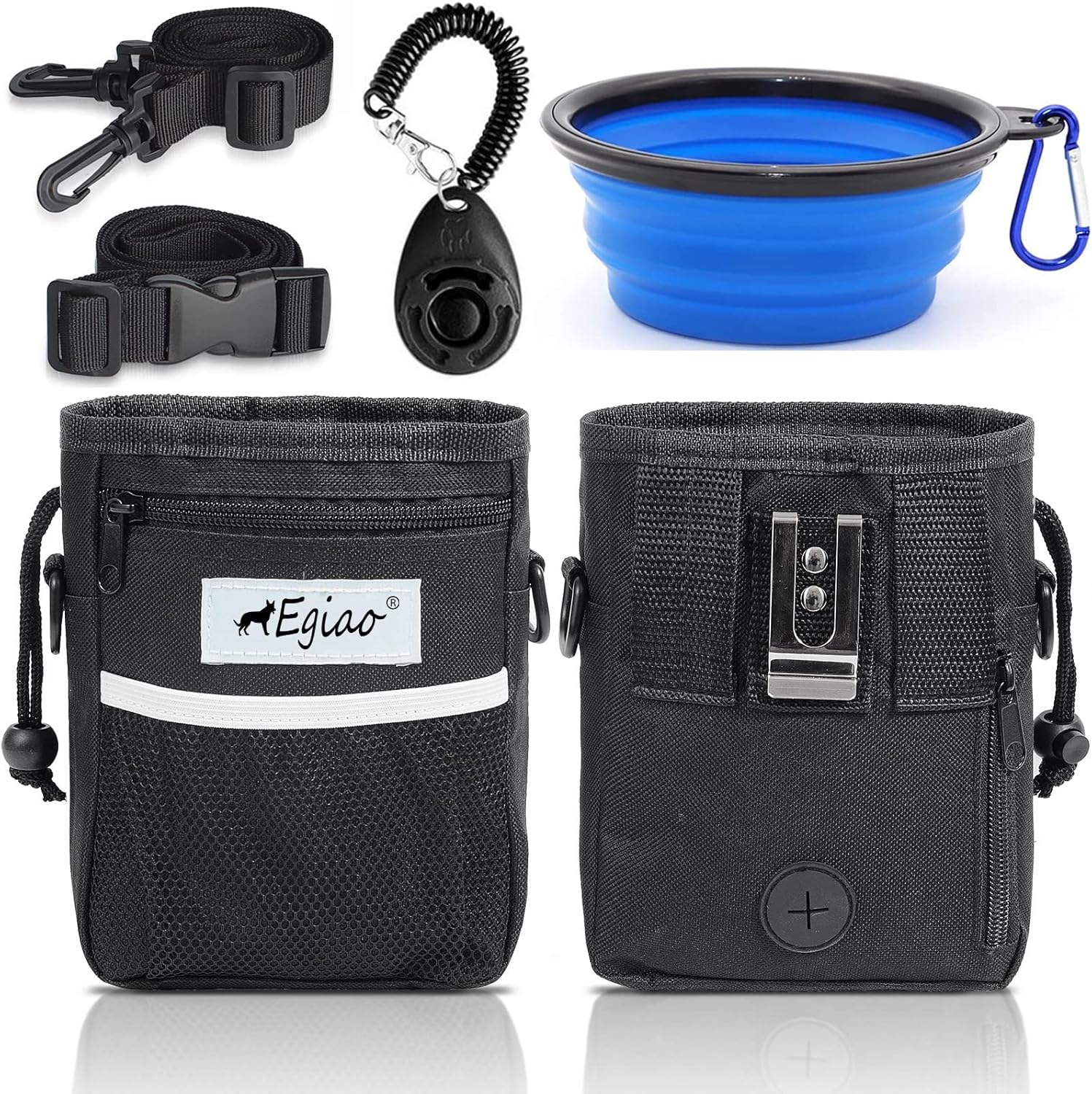 - 🐾5PCS Dog Training Kit: Includes a multifunctional dog training pouch, a collapsible dog bowl, a training clicker, a waist strap, a shoulder strap