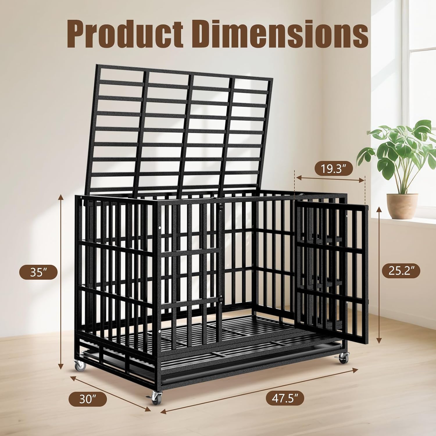 48 Inch Heavy Duty Dog Crate Kennel with Wheels, High Anxiety Indestructible Dog Crates for Large Dogs, XL XXL Extra Large Dog Crate with Removable Plastic Tray, Two Locks (Black, Square)
