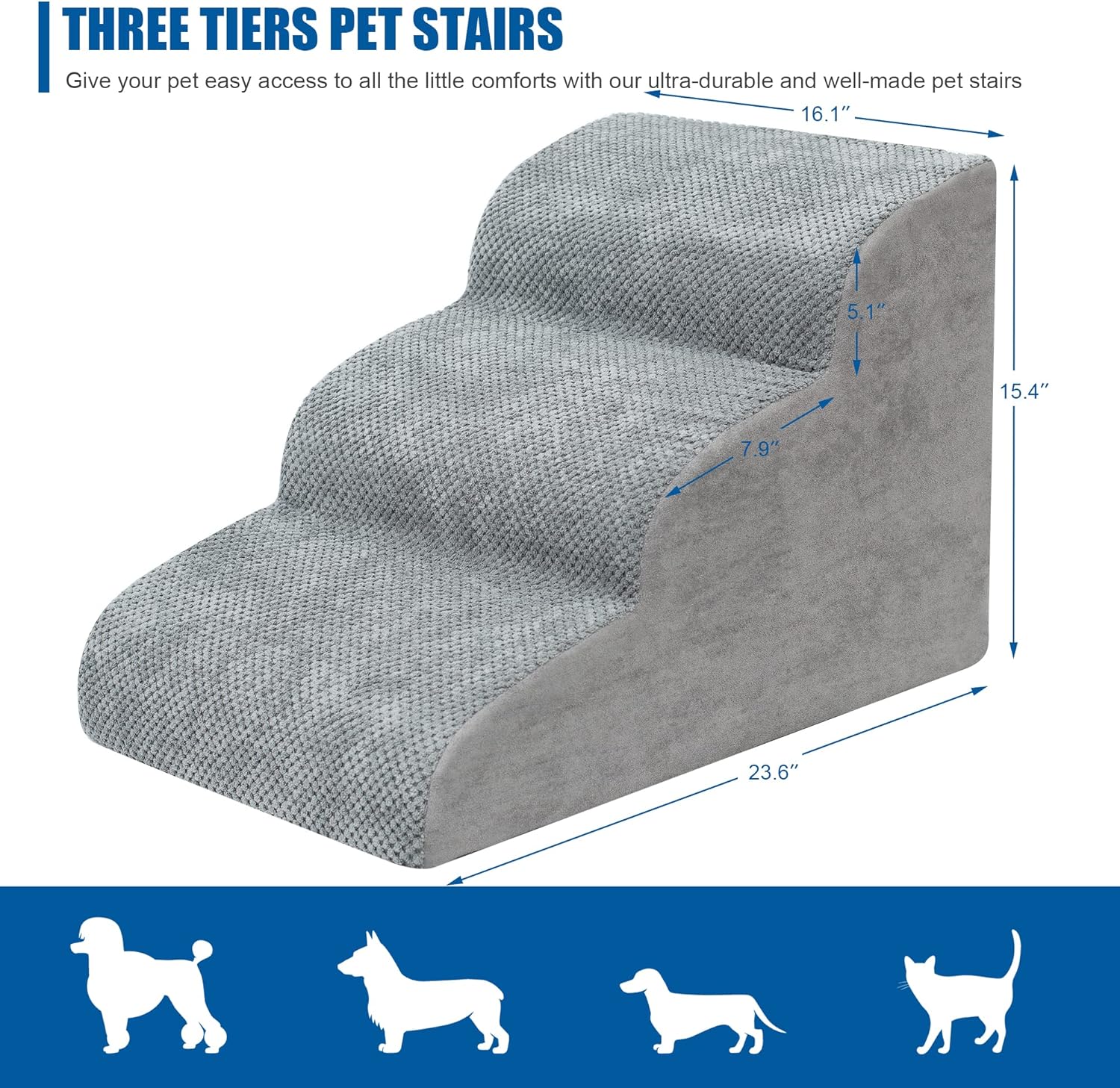 - Easy to Install and Clean: This pet step is 23.6 inches long, 16 inches wide and 15 inches high. It can be assembled and disassembled through simple steps. It is easy to clean. You can wash the removed cover by machine to keep the pet step clean and tidy