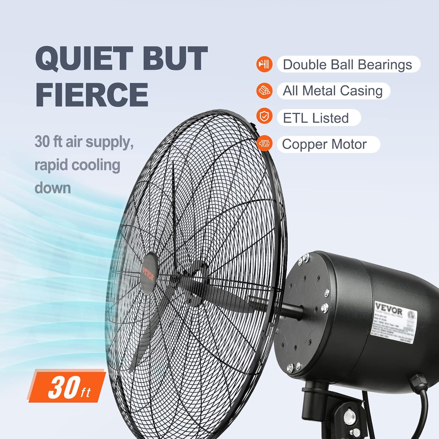 VEVOR 30 Inch Wall-Mount Misting Fan, 3-speed IP44 Waterproof Oscillating, Max. 9500 CFM Wall Mounted Fan for Outdoor, Commercial, Residential, Greenhouse, Workshop, Patio, Black, ETL Listed