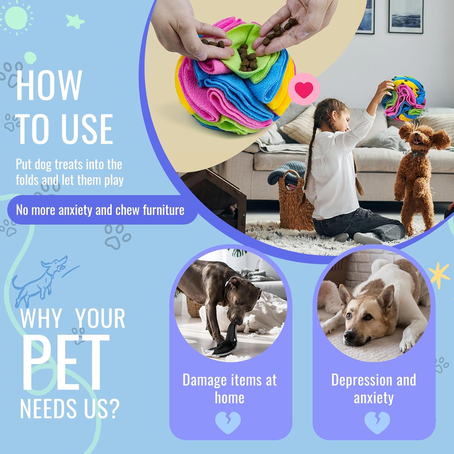 - 🐶Accompany your pets 🐶 We are a family, while your pets accompany you, our Larimuer snuffle balls also accompany them. Our snuff balls are made of high-quality, odorless polar fleece material, taking care of your pet's health.