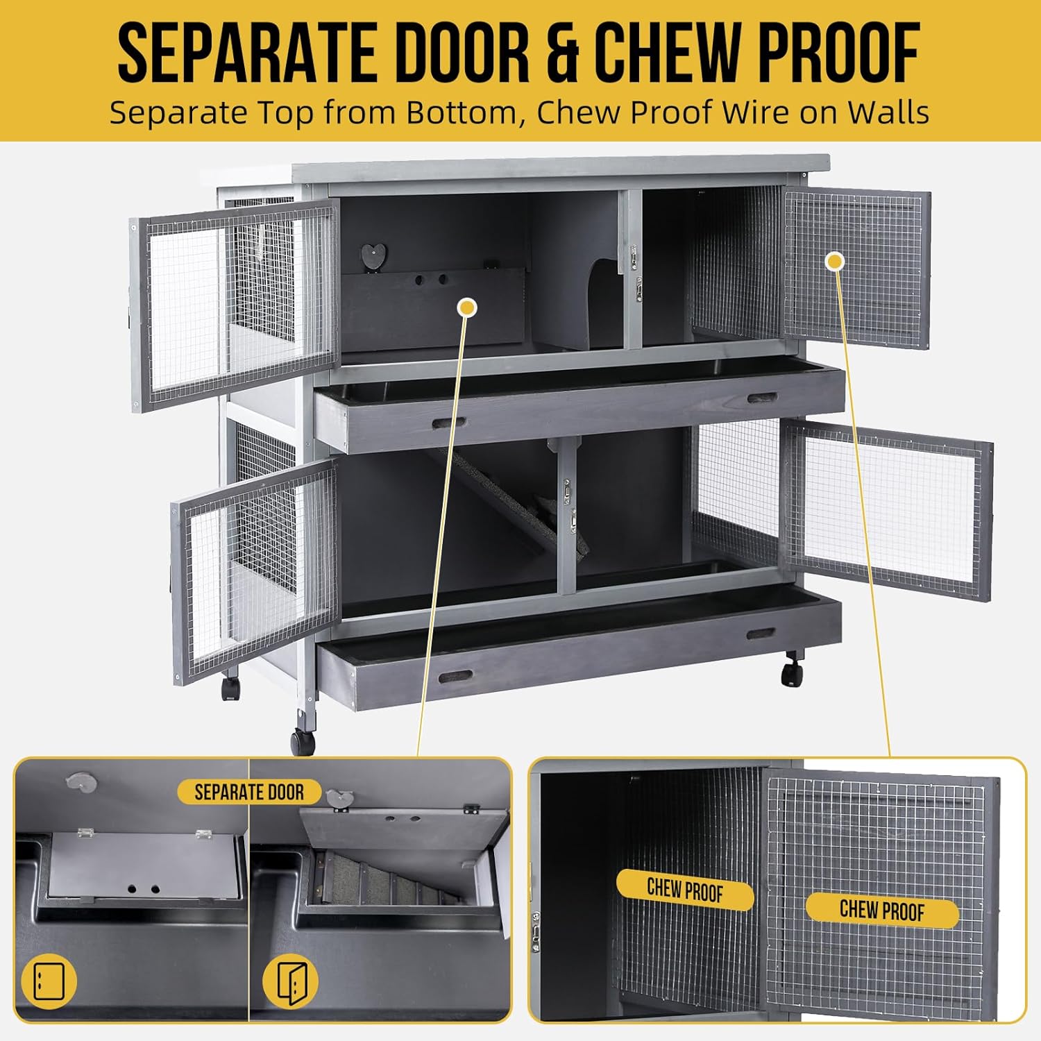 Rabbit Hutch Bunny Cage Indoor Outdoor with Wheel Deeper Tray Chew Proof Guinea Pig Cages 2 Decks Large Rabbit House with 4 Wooden Doors Weatherproof 41.3" L*17.3" W*41.3" H