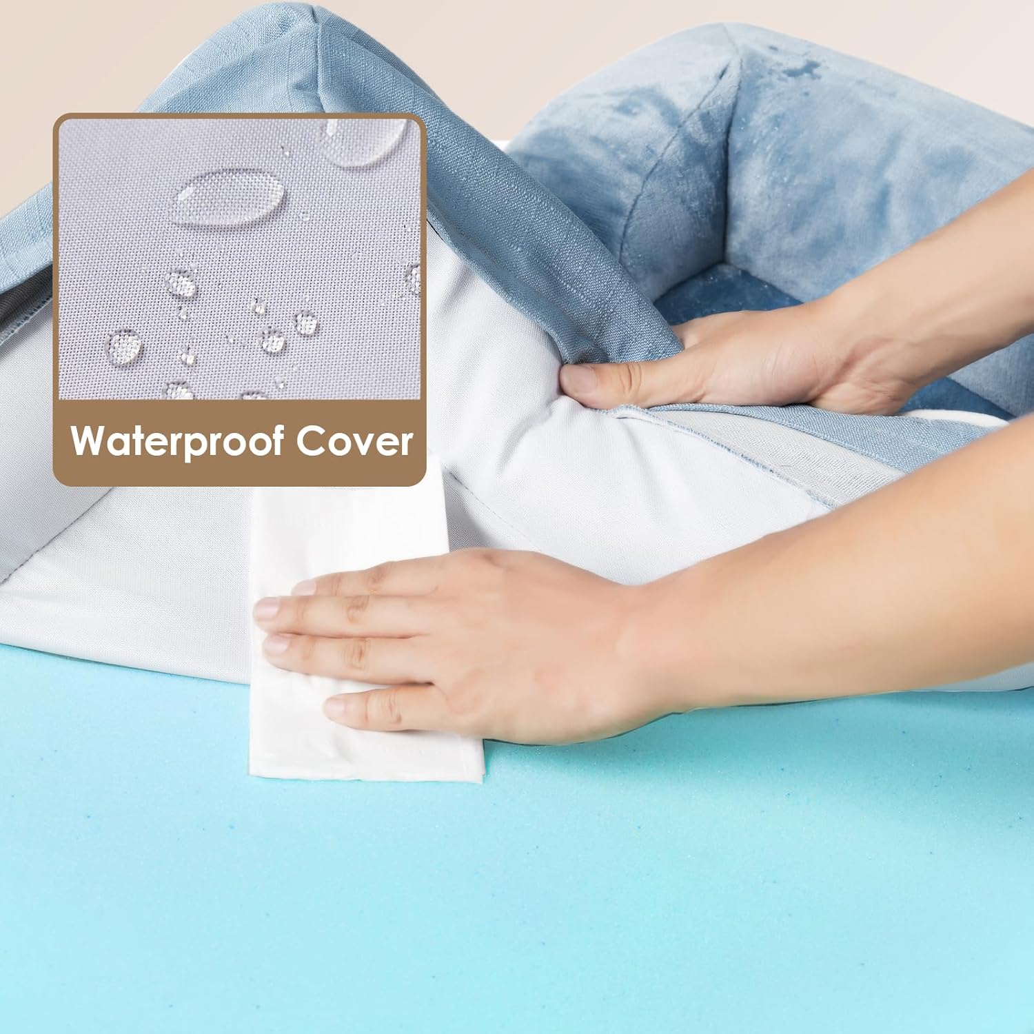 • WATERPROOF COVER: A waterproof film is positioned between the fleece surface and the bottom fabric, ensuring the dog bed remains dry. However, the faux linen sides are not waterproof.
