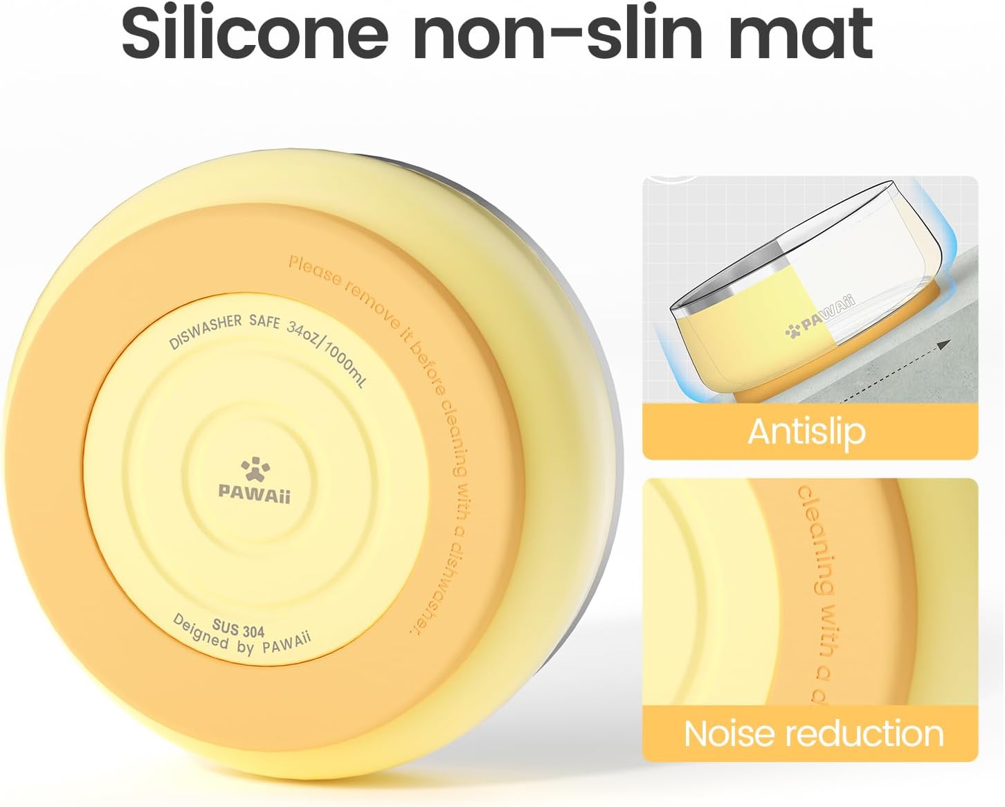 Pawaii Stainless Steel Dog Bowl with Non-Slip Rubber Base & Double Wall Insulation - Durable Design | Includes ID Tag | Dishwasher Safe Food & Water Bowl for All Dogs (34oz)