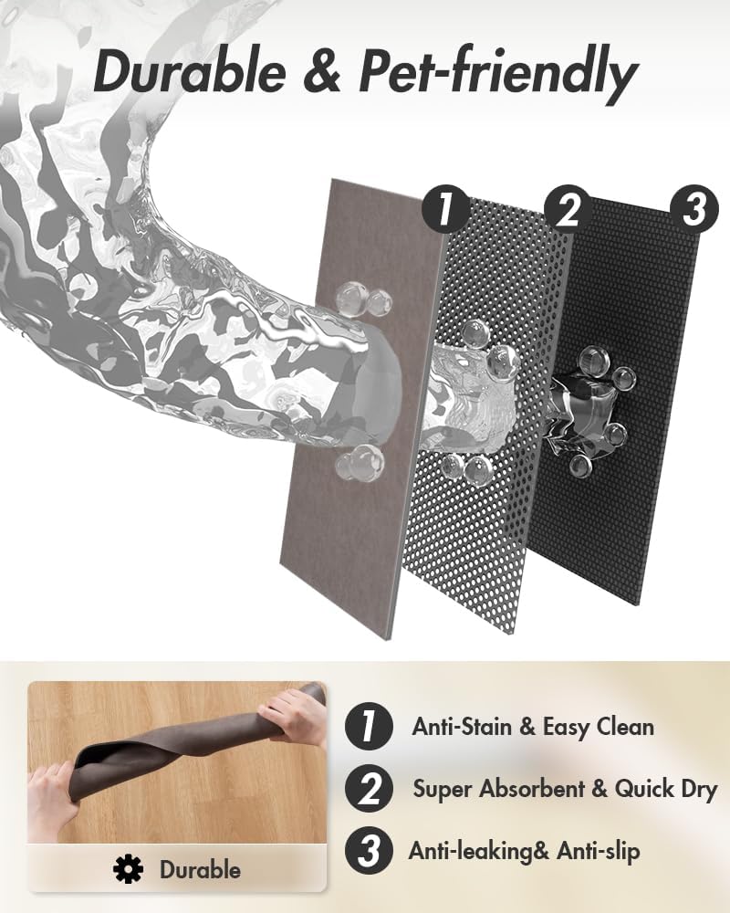 • Super Absorbent & No Stains: Special absorbent surface hide any messy stains completely.​ Magic pet food mat catch every drip off pets' chin around the pet water or food bowl. Prevent Say goodbye to spread stains and messy feeding area.