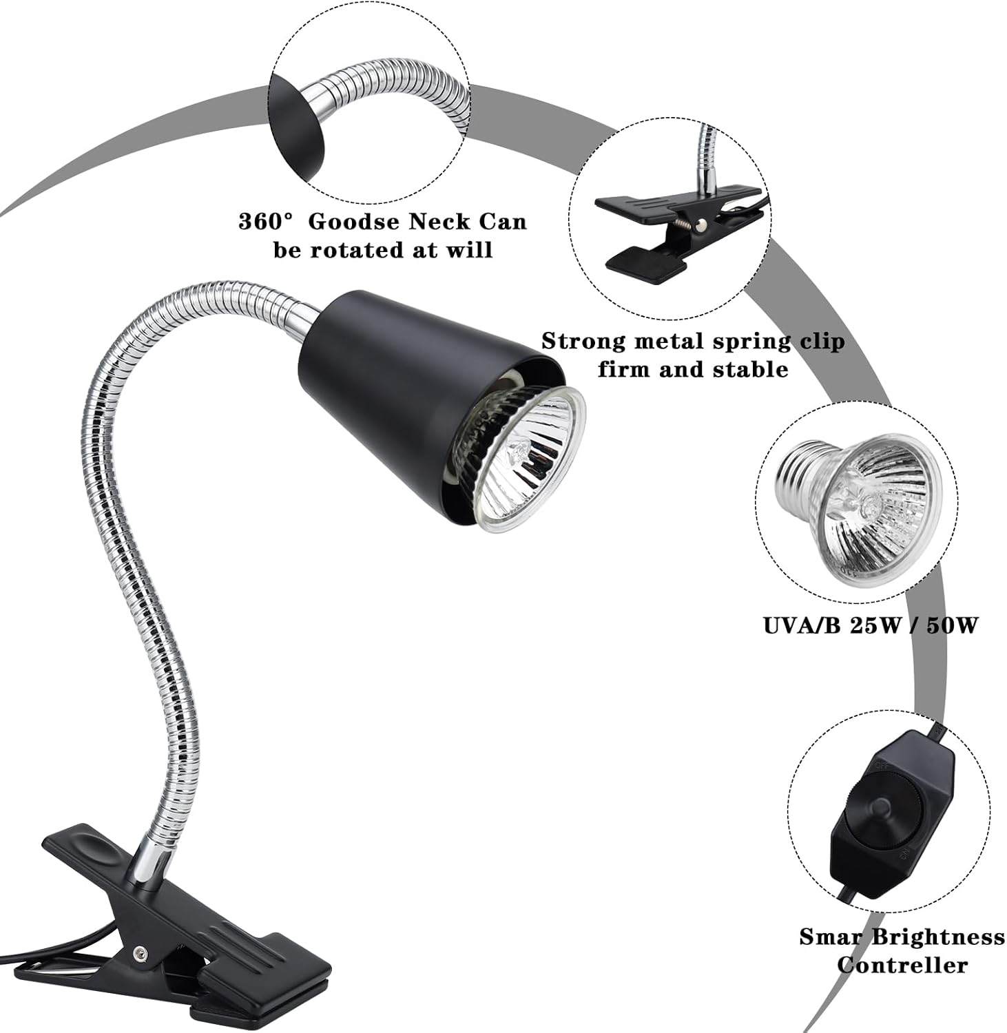 - Flexible Goose-Neck Design: The goose-neck design of the reptile heat lamp offers flexibility and adjustability in positioning. You can easily direct the light and heat exactly where your reptile needs it most, ensuring they have access to a comfortable basking spot.