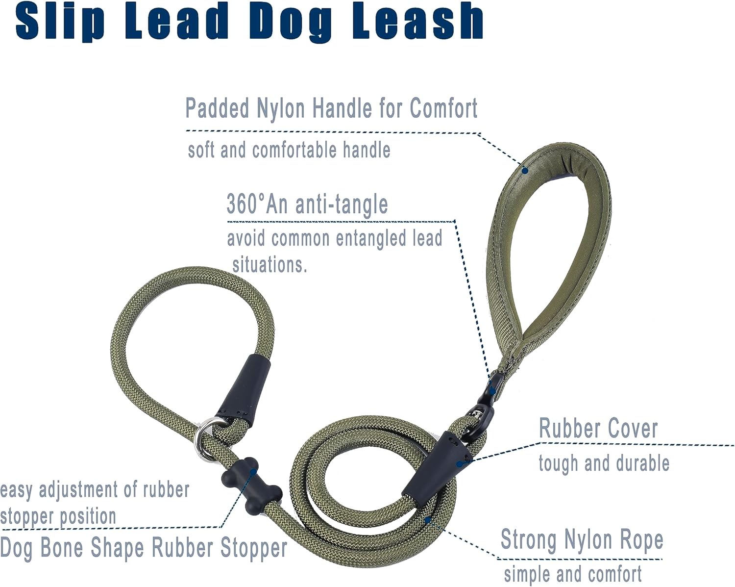- Customized Slip Lead: An anti-tangle slip lead that is stiff enough for walking your dog, yet soft enough to move freely. When your dog moves in different directions (especially when walking multiple dogs), this lead will not tangle because it is constructed to move in line with your dog's movement, not the other way around, to avoid the very common tangling lead situation.