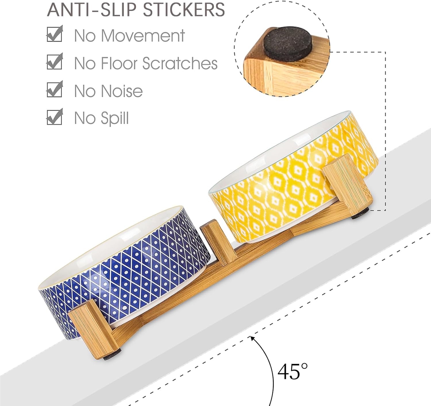 Selamica Ceramic 14 OZ Dog Bowls, Dog Food and Water Bowls with Wooden Stand, Anti-Slip Dog Dishes Set for Cats & Small Dogs, Weighted Pet Bowls Set of 2, Assorted Color A