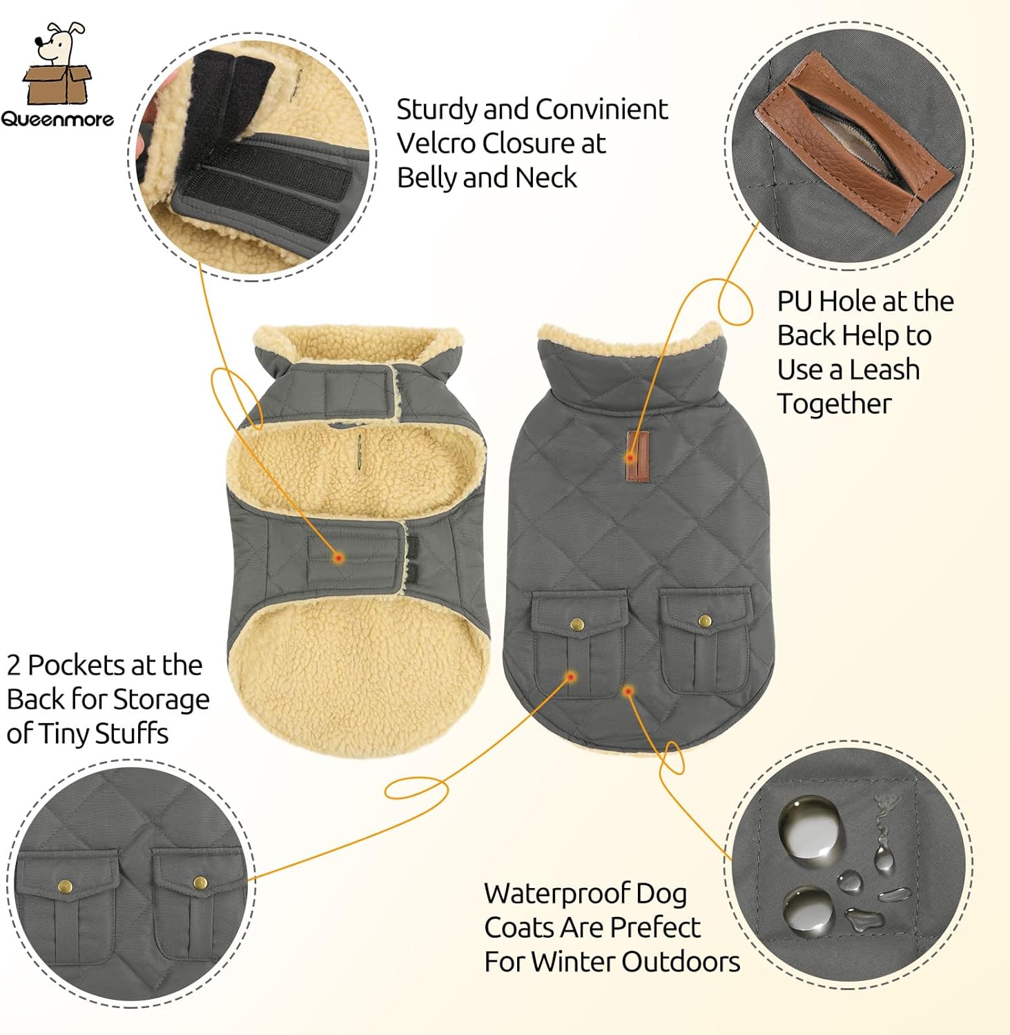 Queenmore Dog Winter Coat - Fleece Jacket, Waterproof Cold Weather Dog Clothes, Thick Warm Cotton Padding, Easy On Storage Pockets (Grey, Small)