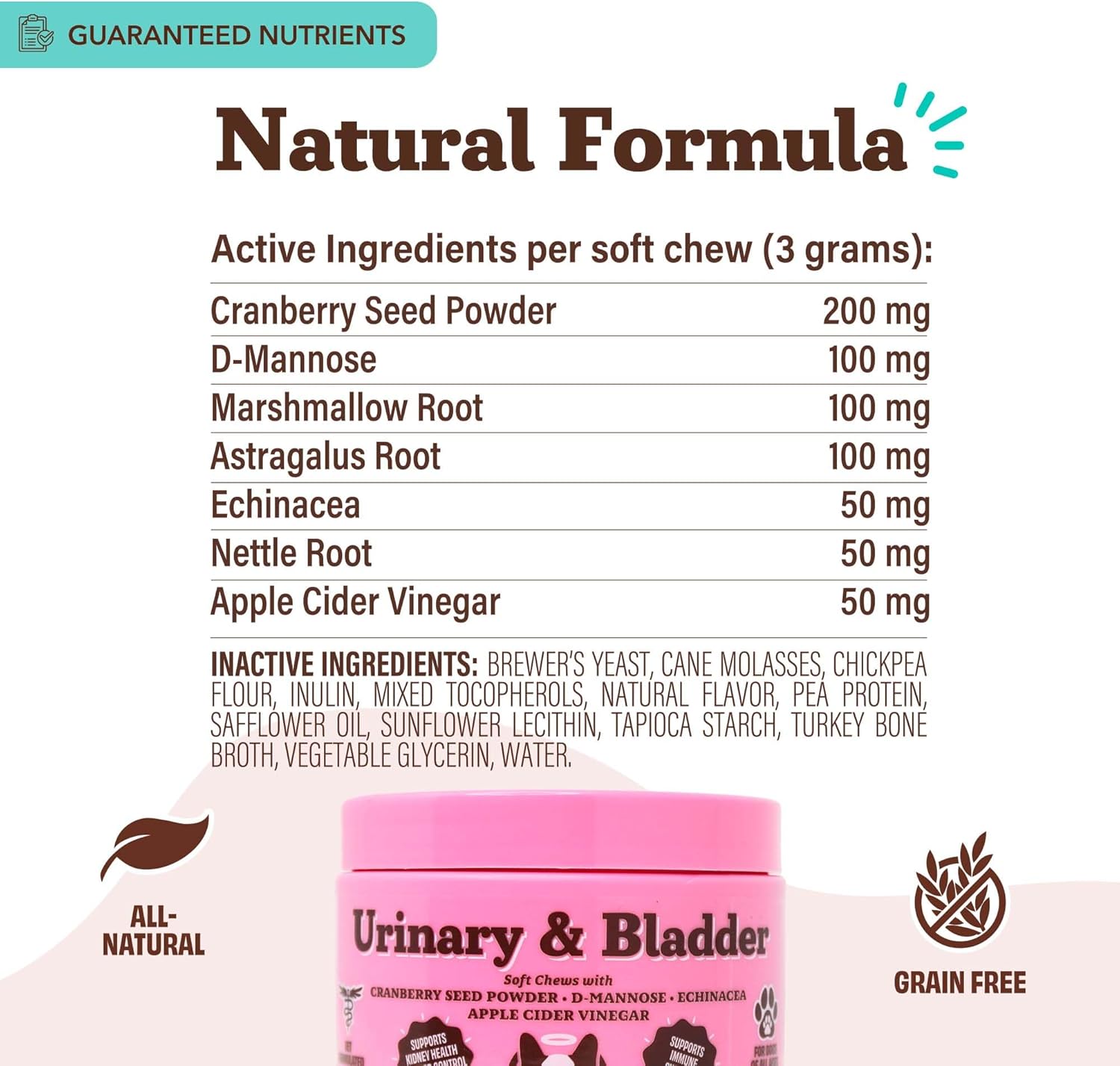 - OPTIMAL BLADDER HEALTH: Ensure your pet’s comfort and happiness with our Urinary and Bladder Soft Chews. These chews provide superior bladder control for dogs and support the entire urinary tract for dogs, helping to reduce discomfort and improve daily life. Trust in our natural formula to keep your dog's bladder health in check and their spirits high.