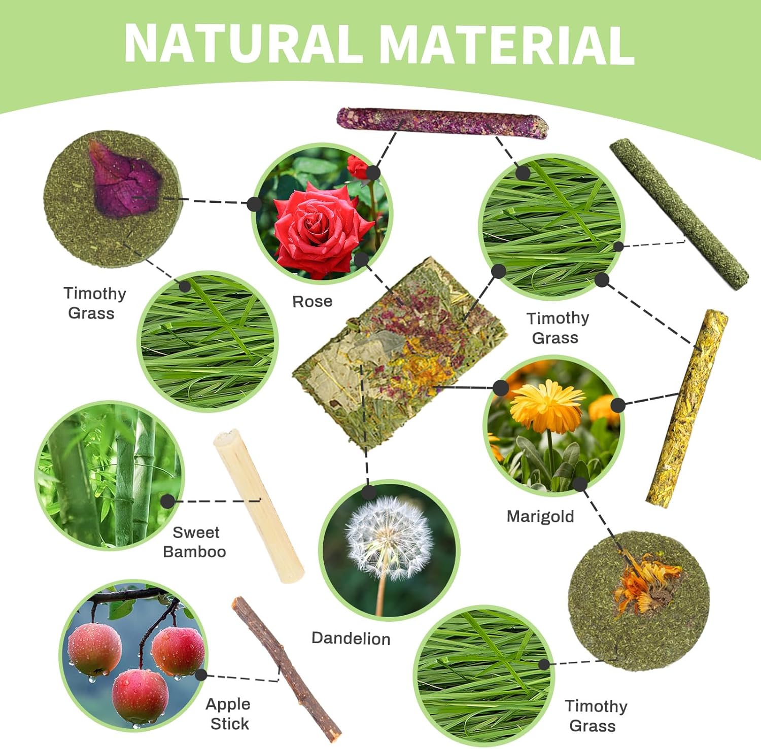 • 【Multiple Chewing Varieties for Guinea Pig Chew Toys】This guinea pig chew toys offers a variety of teething types made of different materials, each with a unique teething action and texture to meet your guinea pig's different teething needs and taste preferences. Natural materials such as Dandelion, Timothy Grass, Sweet Bamboo and Apple Twigs with their various flavors attract pets to chew and grind their teeth better and effectively exercise the chewing muscles of pets.