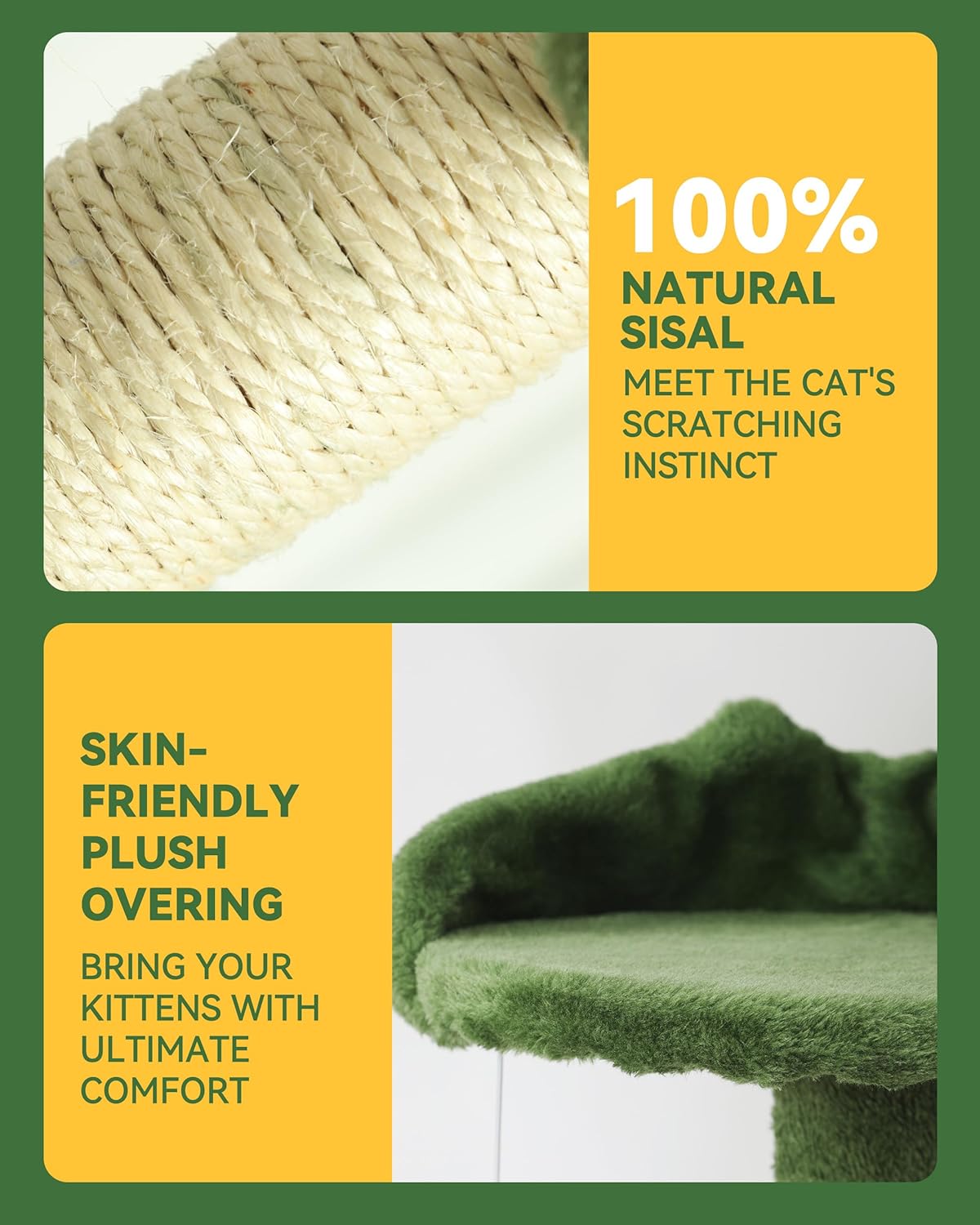 • Nature-Inspired Design: Our cat tree is adorned with verdant green plush and apricot sisal scratching posts, elegantly intertwining these two refreshing and natural hues into a seamless whole. Even indoors, the tranquil ambiance crafted by the cat tree evokes the sensation of being in the midst of nature