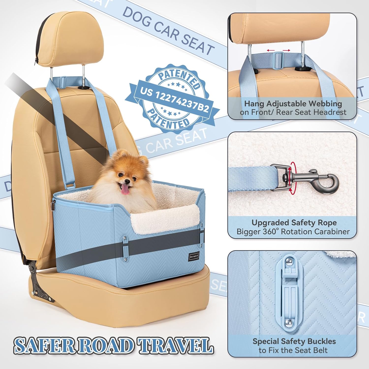 • [Safety First] The dog car seats for small dogs offer your little one to stay comfortable and secure without disturbing you when you driving. The adjustable clip-on leash is hidden under the removable booster cushion, it hooks the dog's harness to avoid the pet from jumping out. Patented buckles provide more stable security for your travel.