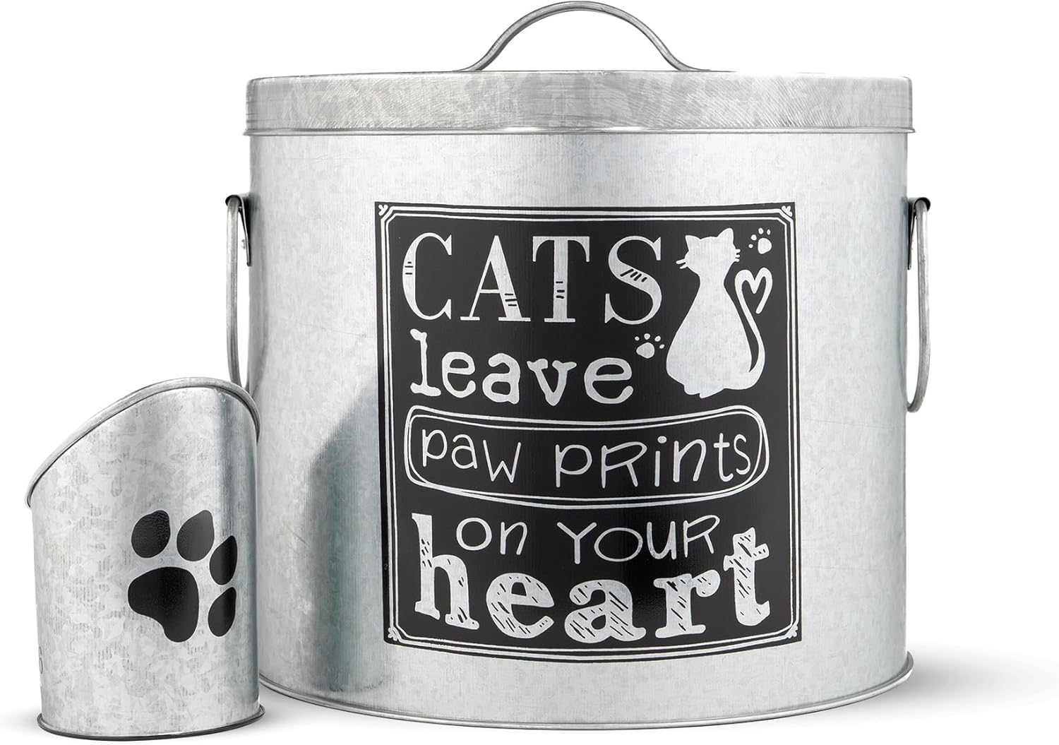 • BEAUTIFUL DESIGN: Modern, sturdy, but rustic cat food container used for pet food storage provided with a scoop for easy serving. Your cat will love watching you open the tin canister in anticipation!