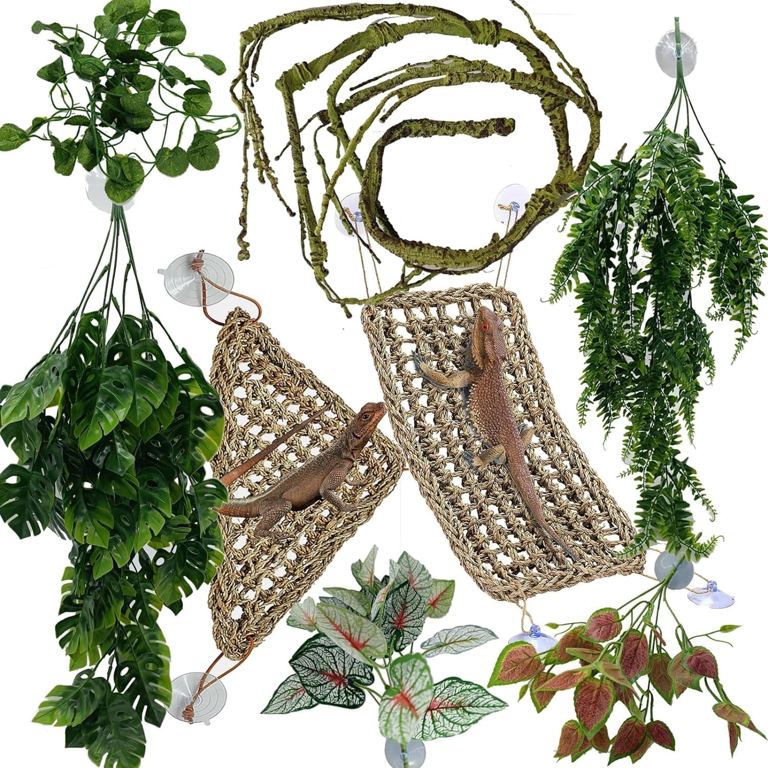 • 【Include】1 x Large Triangle and 1 x Rectangle Hammock, 2 x Large Plastic Hanging Leaves vines, 1 x Flexible Bendable Reptile vine branch of 47 inch / 120cm in length, 1 x vine leaves decor, 2 x mini Hanging Ivy Plants of 12 inch / 31cm in length, 6 x large/strong suction cups of 2 inch / 5cm in Dia. Perfect for reptile habitat decorations, terrarium hanging, snake terrarium decorations.
