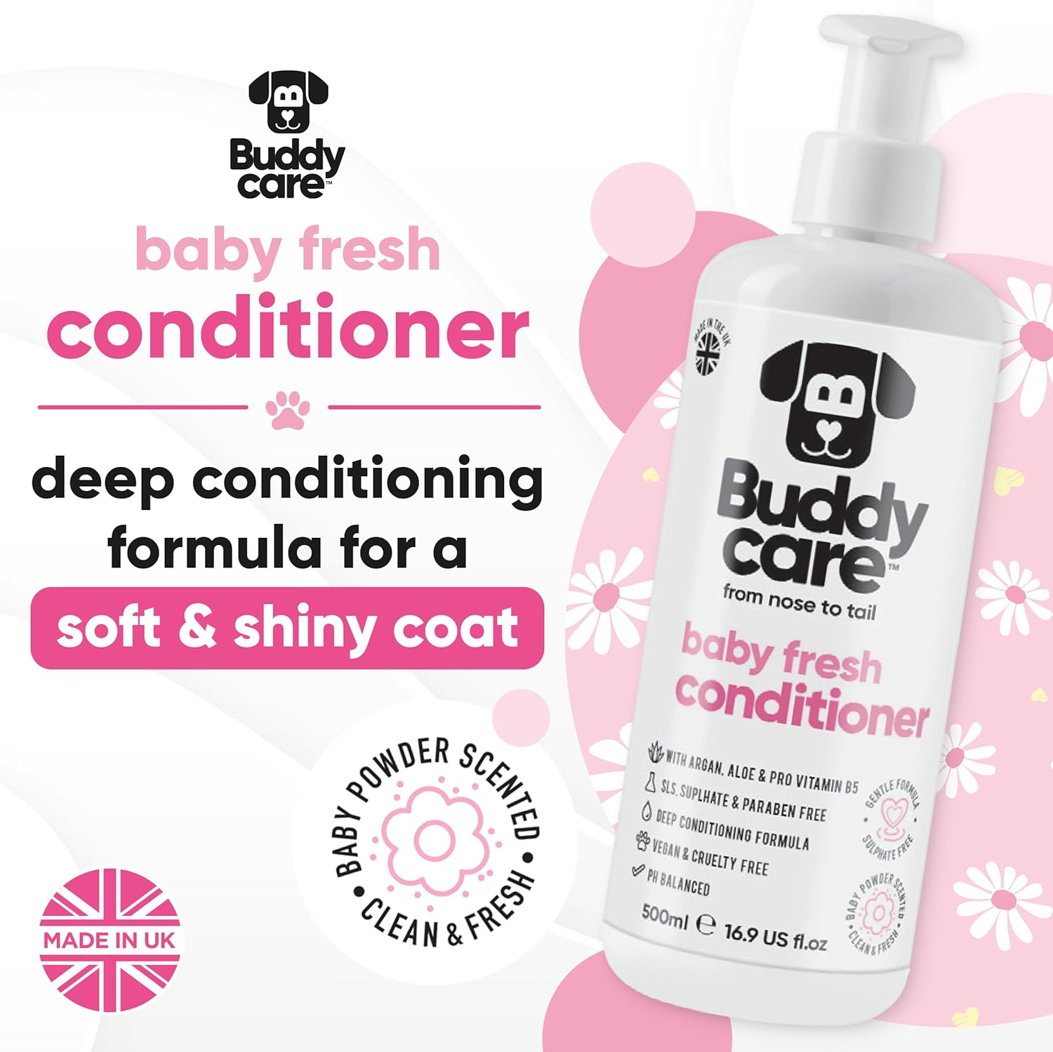 - SOOTHING DOG CONDITIONER – Buddycare soothing, detangling Baby Fresh dog conditioner works alongside our range of dog shampoos and is the ideal final step in your pet’s grooming routine. Simply massage into your dog’s wet fur after our cleansing dog shampoo, focusing on the matted and tangled areas. Rinse thoroughly with warm water and towel dry for a clean, baby fresh scent and silky-soft finish.