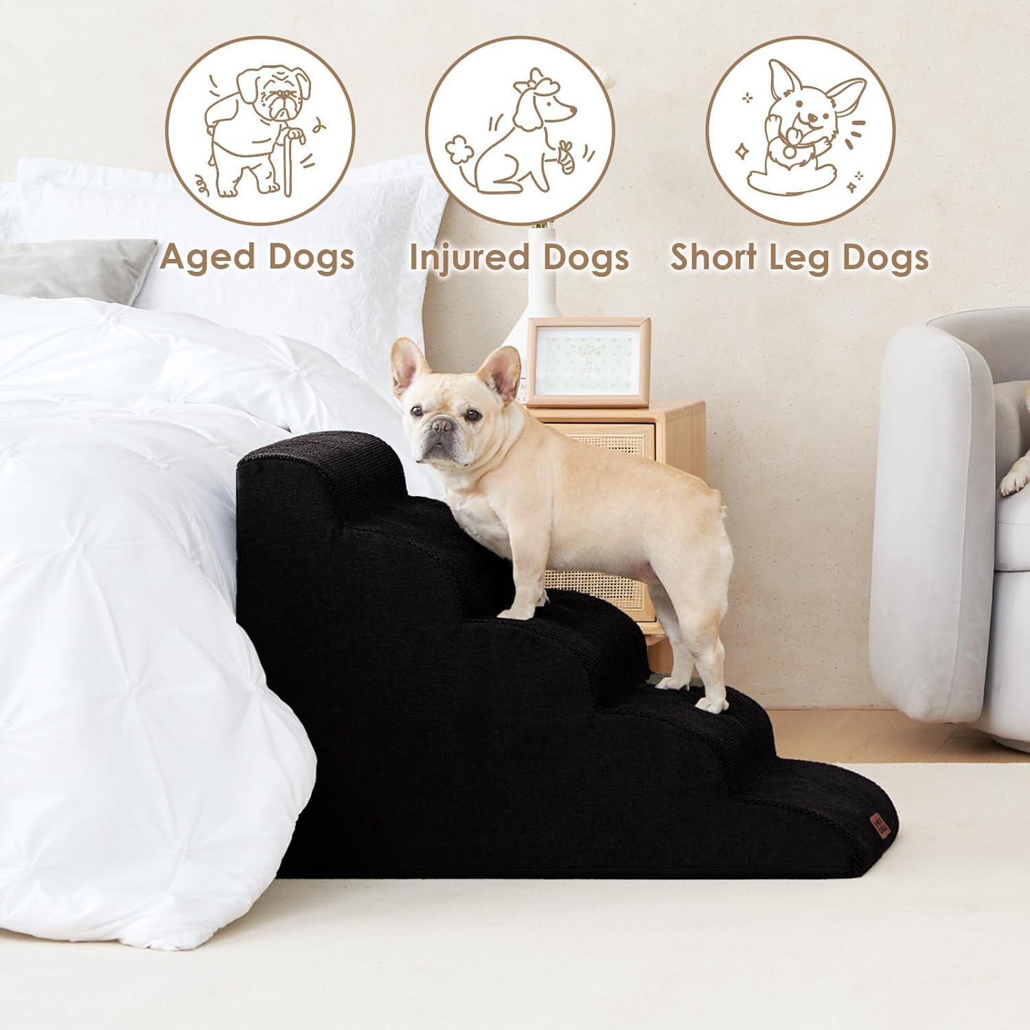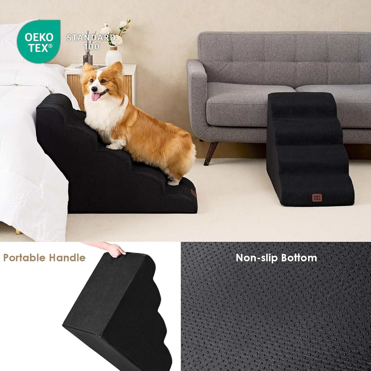 - COMFORTABLE PET STAIRS - This foam dog stair is designed directly against the edge of a bed, sofa or other furniture, so your pet can climb up and down comfortably.