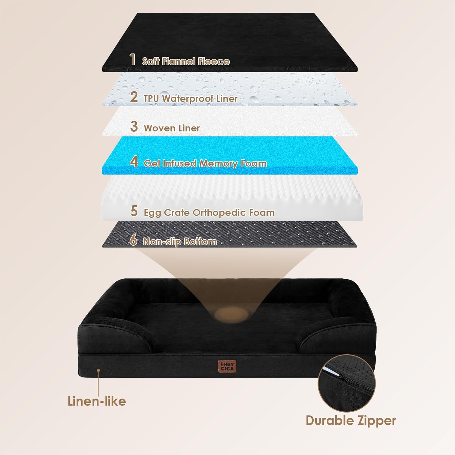 - WATERPROOF COVER: A waterproof film is positioned between the fleece surface and the bottom fabric, ensuring the dog bed remains dry. However, the faux linen sides are not waterproof.
