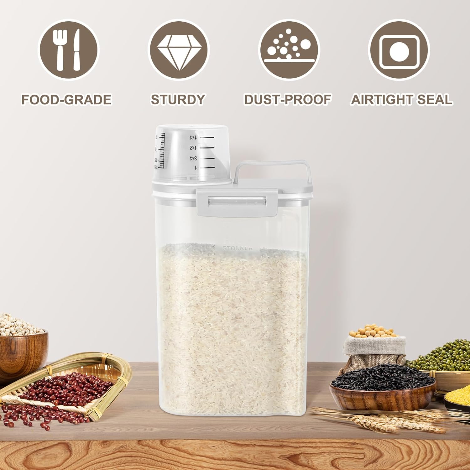 - Versatile Storage Container: The portable rice dispenser will fit your many storage need, from storing dry food to laundry detergent. The rice container normally can hold 4 lbs of rice and capacity will vary depending on different food