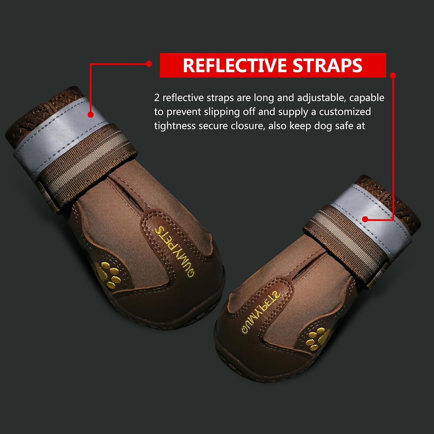 • SECURE and ADJUSTABLE: Easy to put on / off. These dog shoes expands with a wide split seam opening and two adjustable and reflective straps to ensure a tight fit, also make your dog safe at night.