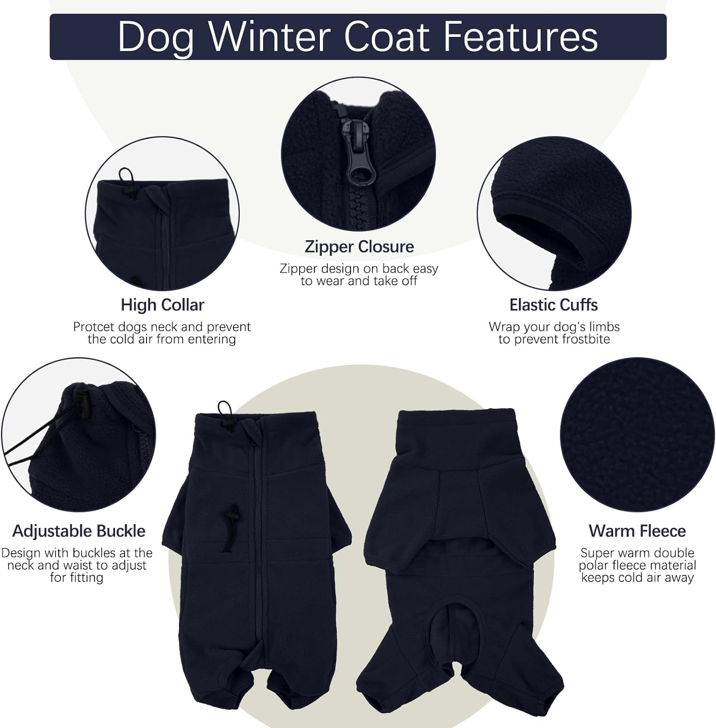 - Unique Design: The dog cold weather jacket clothes utilizes double polar fleece material with four legs; offers superior insulation and larger coverage compared to two-legged coats; perfect for jogging, walking, running, hiking, and other activities