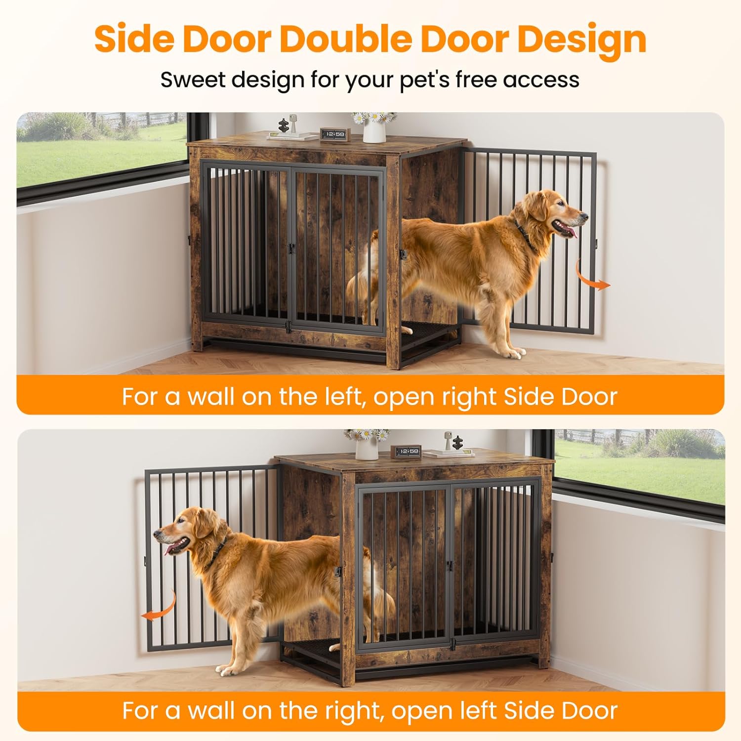 - 【Double Side Door Design】This furniture-style dog kennel indoor has front and two side openings for access, both the left side door and the right side door can be opened to fit various spaces, definitely an ideal crate for your home