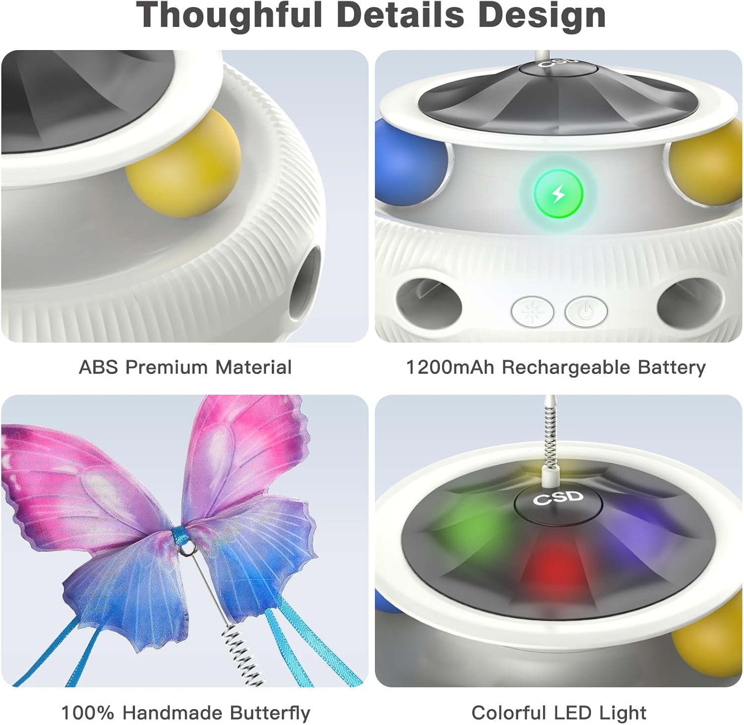 • Multi functional interactive cat toy:The cat stimulation toys for indoor cats combines with cat fluttering butterfly toy,track ball toy and random shooting feather toy,which provides cat's hunting instincts: chasing, pouncing,ambushing.And multiple play modes keep the kittens entertaining