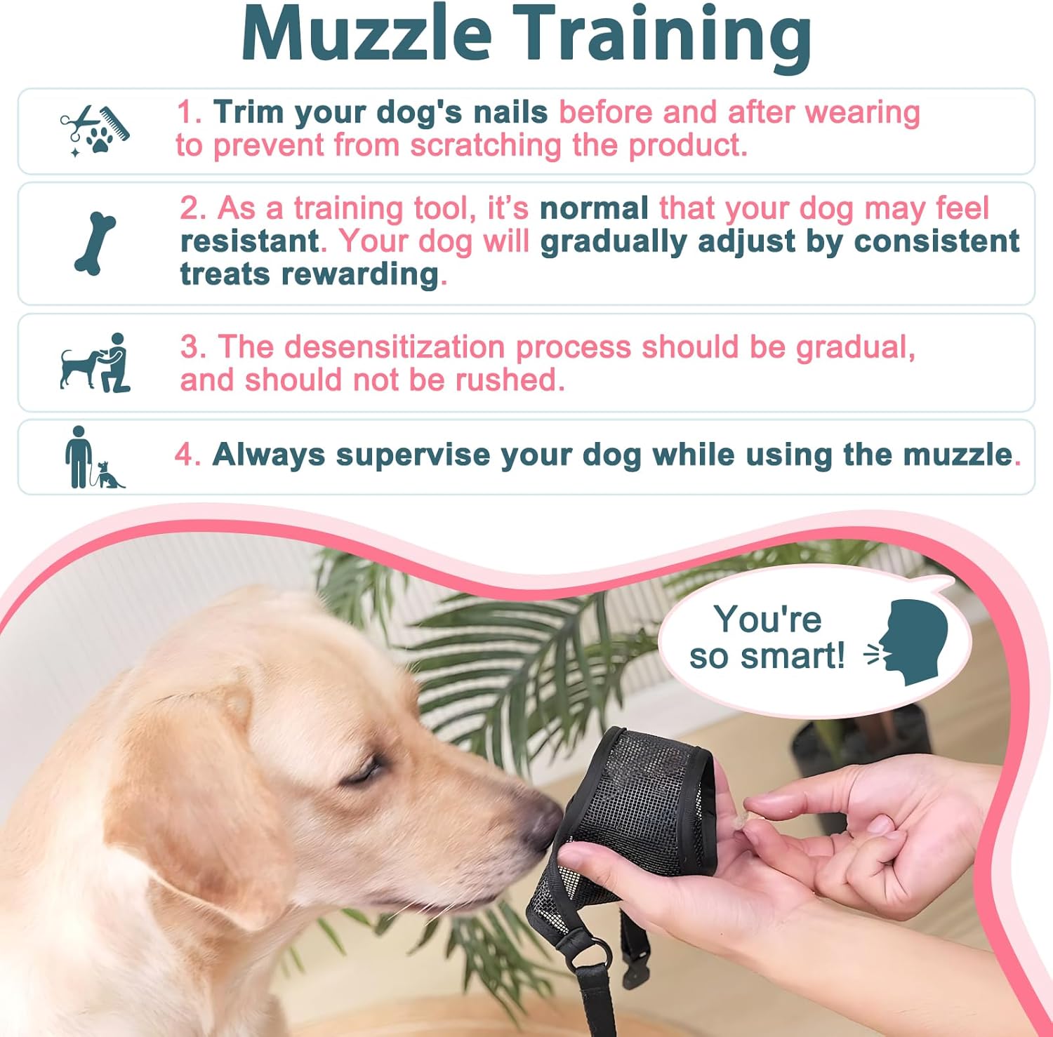 • Effective Muzzle Training Before Stress-Free Use: It’s normal for dogs to try to escape the muzzle when stressed or anxious. Muzzle training aims to make the experience positive through rewards like treats, reducing discomfort, fear, and escape behaviors. Follow the Video guide and Instructions step by step to maximize the muzzle's effectiveness. As dog owners, work through behavioral issues instead of using the muzzle to cover them up