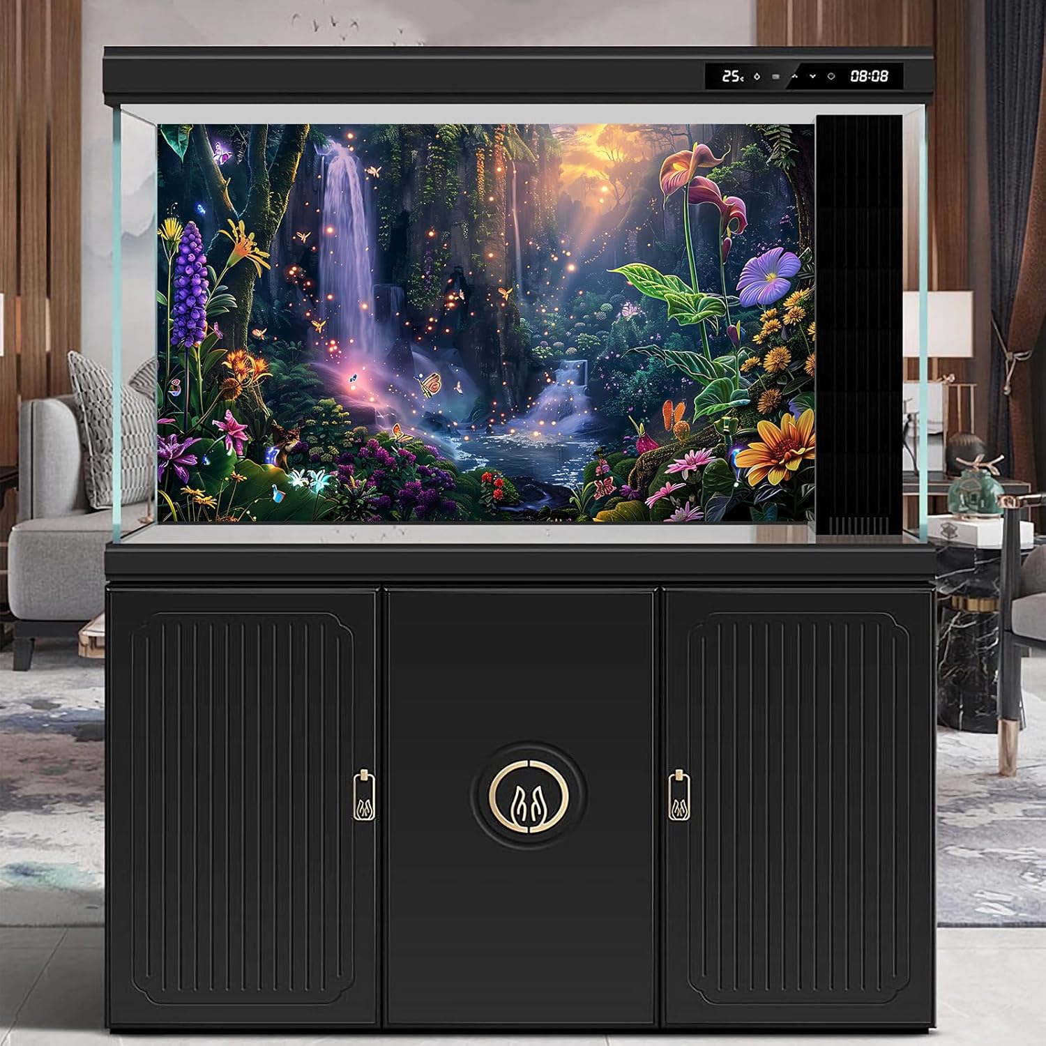 Fantasy Garden Aquarium Background Sunset Waterfall and Flowers Terrarium Backdrop Tropical Forest Lush Plant Magic Butterfly Lights Flowers Fish Tank Background Poster Decorations 24x12in