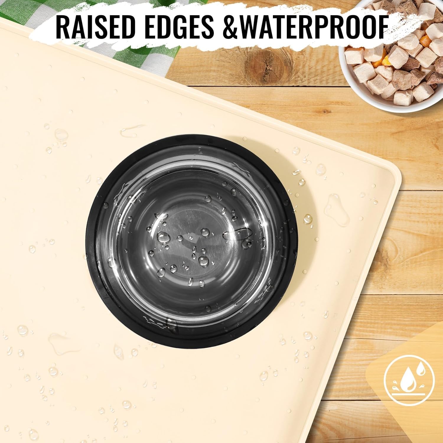 MateeyLife Dog & Cat Food Mat, Waterproof & Nonslip Silicone Feeding Mats for Dogs and Cats, Raised Edge Tray for Messy Drinkers, 18"x12", Beige