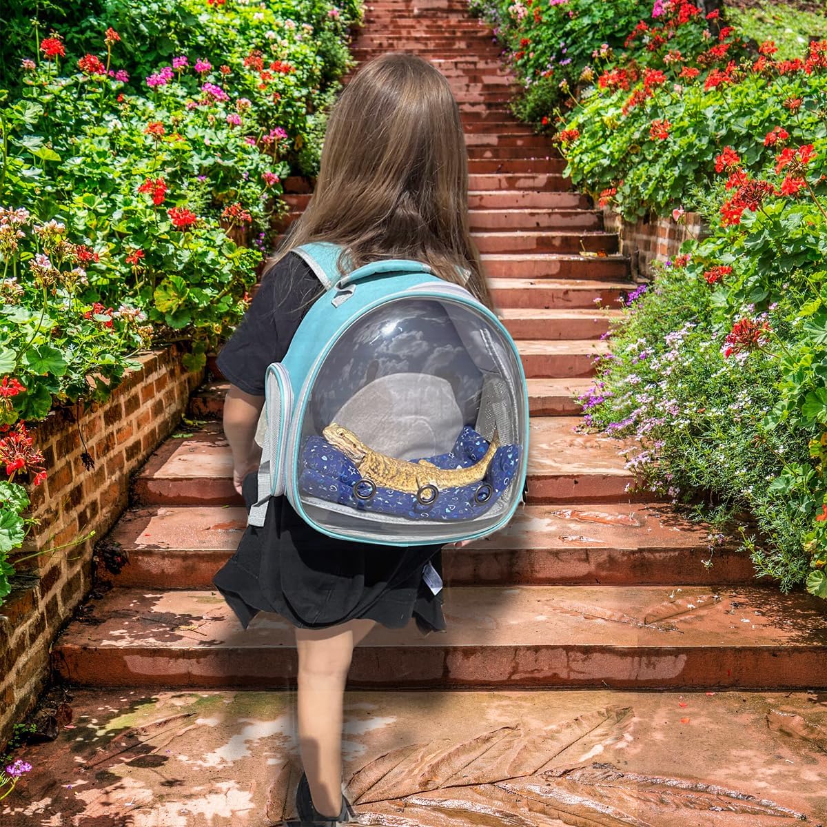 - Bearded dragon backpack carrier with leash and harness set has a big bubble Window. The front hard clear bubble window is better to protect reptile from crushing and attacking if accidents, it also provides a nice front view so they could check surroundings without anxiety.