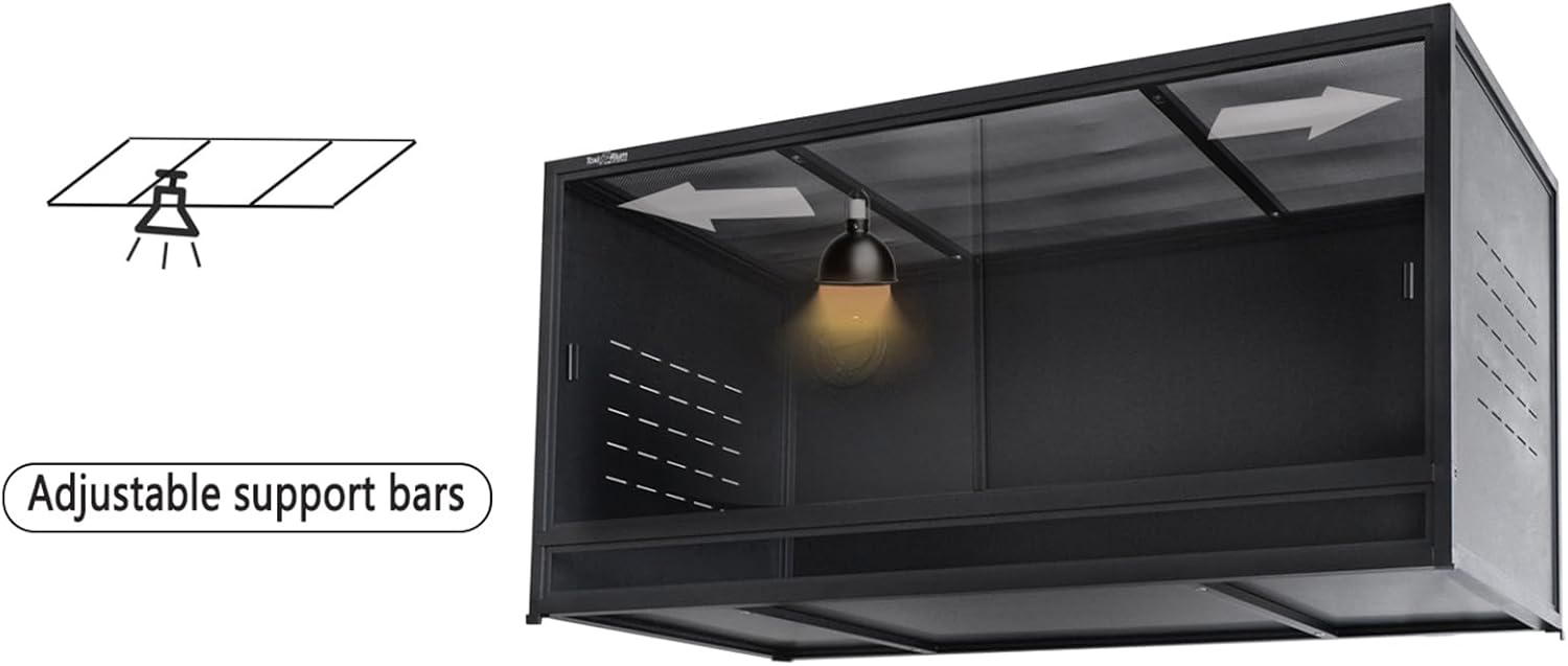 - ăHeat Humidity Retention and Top Ventilationă: The side panels of ToxiRium Reptile Terrarium are made of PVC material, which helps keep heat and humidity. The top screen mesh provides great ventilation, and two crossbars can be moved in parallel, enabling you to adjust the position of the hanging heating light or UVB reptile lamp. 1 cm raised bottom to facilitate the mounting of a reptile substrate heater