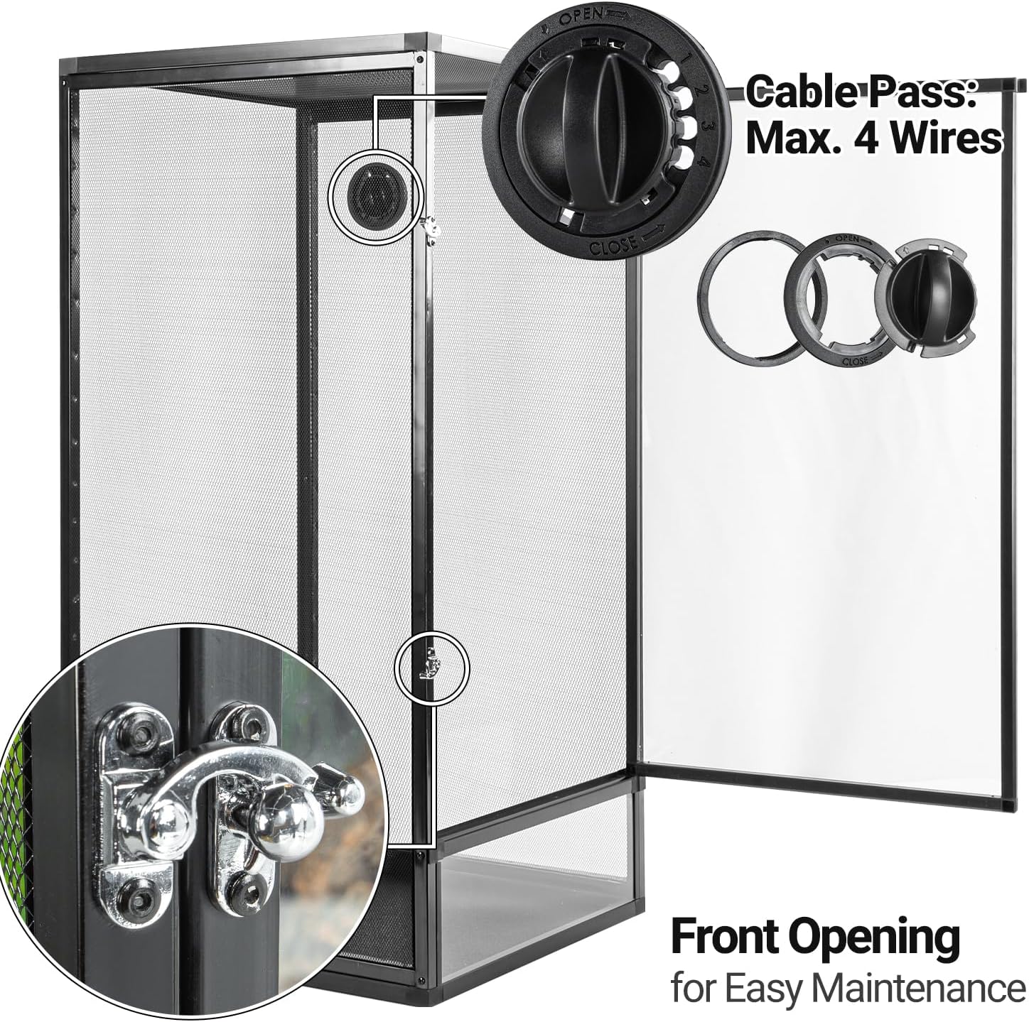 • Front Opening & Optical Holes: The door of this Cage is equipped with a lock and can be opened completely, offering unmatched convenience for daily cleaning and feeding. The side cable outlet holes ensure tidy cable management. and come with background sticker and a removable PVC tray, you can install and use it according to reptile's needs