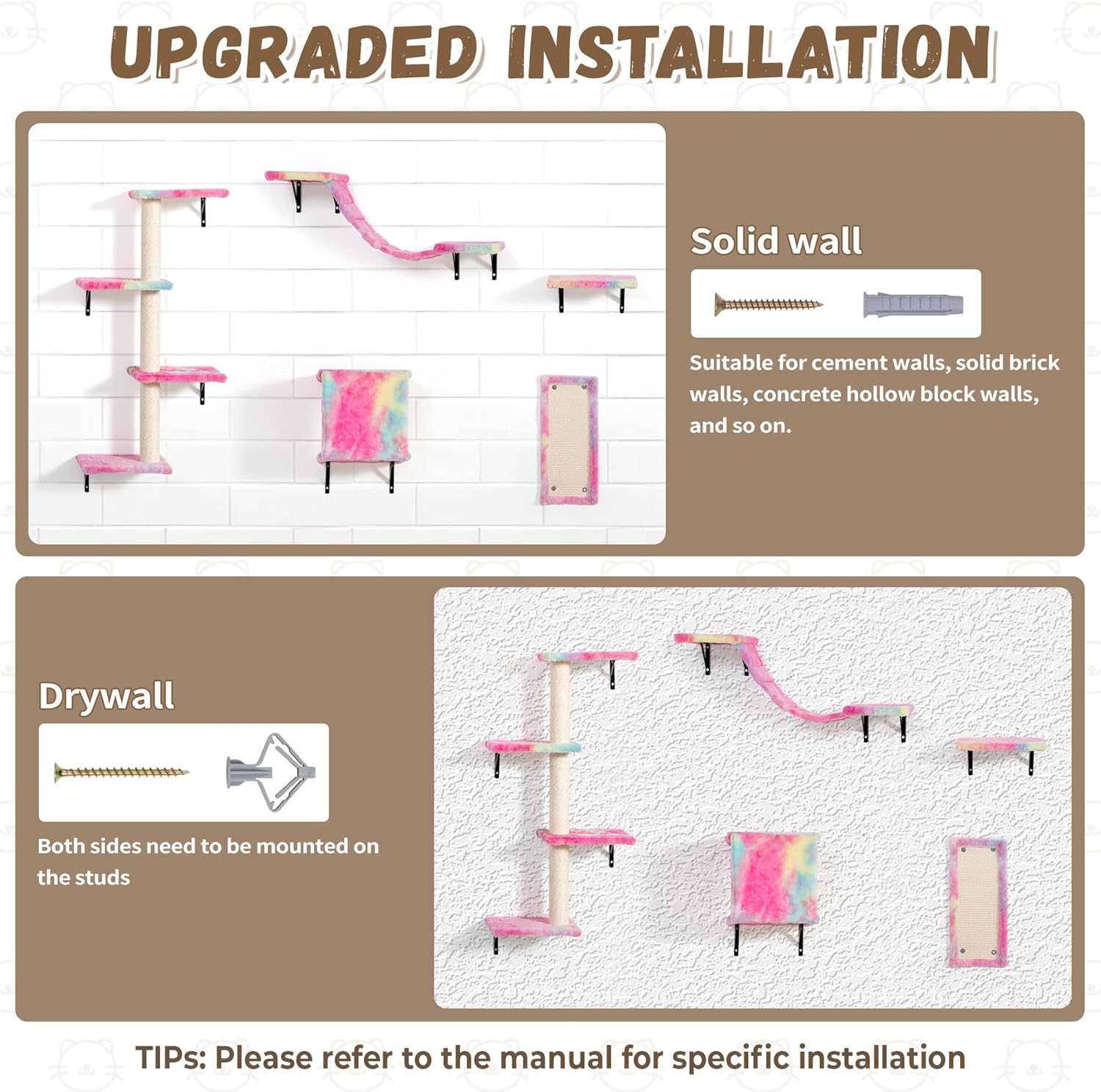 - 【Space-Saving Design】: Adopted wall-mounted design, this cat-shelf set can save ground space and increase your cat's play space as well as broaden their horizons. Besides, the position of each piece can be adjusted independently.
