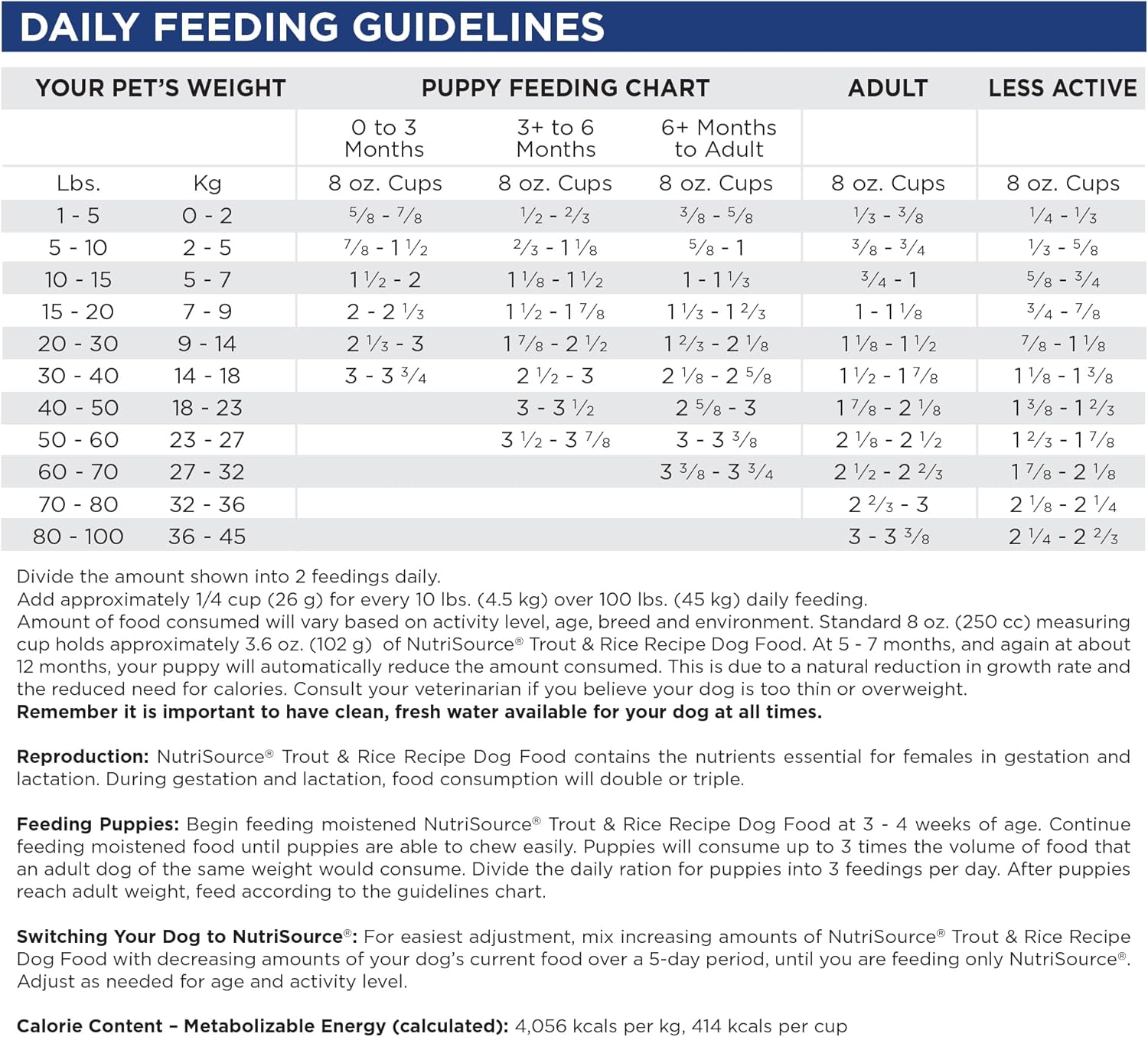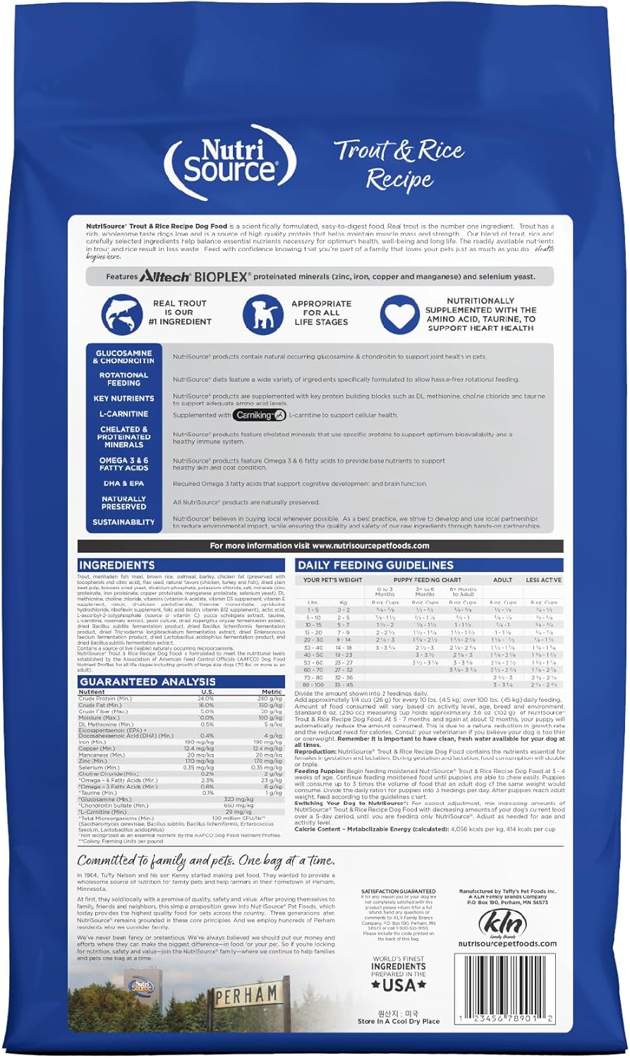 • As a member of our grain inclusive series, NutriSource Trout and Rice Dry Dog Food is formulated to meet AAFCO guidelines for all lifestages