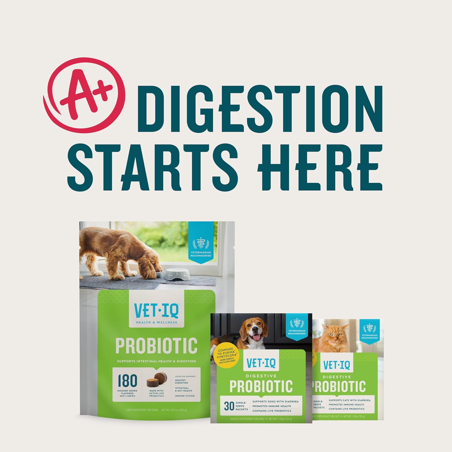 - Health Supplement for Dogs: VetIQ Probiotic soft chews are the perfect way to keep your dog’s digestive health on track; These soft chews help to support your dog’s digestion when switching to a new food or dealing with occasional tummy troubles
