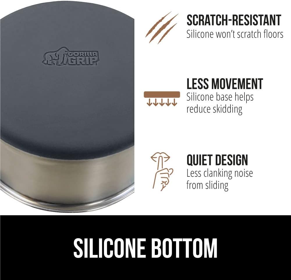 - SILICONE BOTTOM: the Gorilla Grip bowl is constructed from durable silicone that helps keep the bowl steady and wonβt scratch your floors; while some over eager eaters may still be able to slide the bowls, the silicone will help prevent much movement; plus, it reduces the noise from clanking and sliding across wood, tile, and more