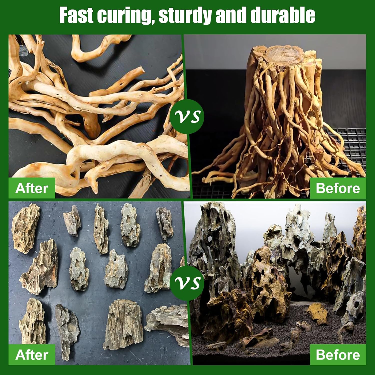 - Tips: This glue is in liquid form and cannot be used underwater. When using paper towels or wood powder as a medium for gluing driftwood or stones, the effect will be better. In addition, the glue will smoke during the curing process. Be careful to avoid being choked by smoke and irritating your eyes. Just wait for a few seconds. After curing, it is colorless and odorless, and there is no other effect. It is best to wait 24 hours before putting the bonded product into water, so that the effect is best.
