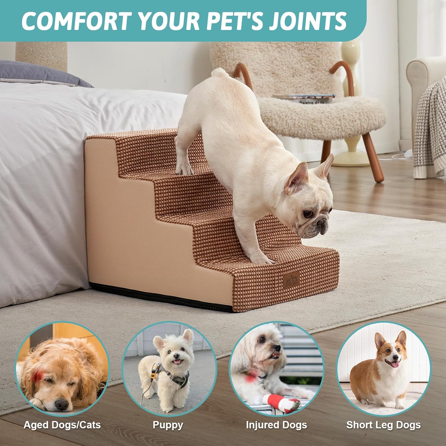 - Widened Pet Stairs: The dog steps feature a widened design 2 inches broader than standard dog stairs, offering enhanced stability while accommodating the needs of small and medium dogs, the extra width provides a safer climbing space for pets. With 4 tiers of height, it allows your pet to reach elevated areas easily