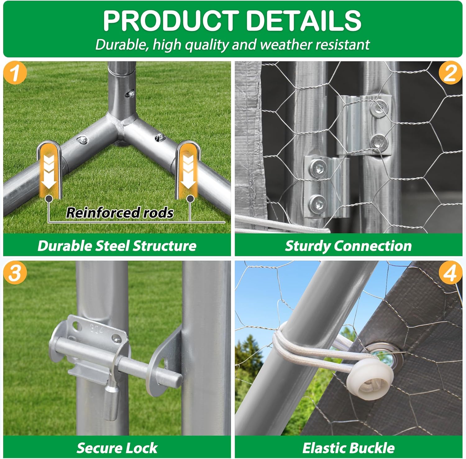 - 🐤WATERPROOF COVER: The metal chicken coop comes with a canopy made of PE fabric, which is waterproof and UV resistant, ensuring your chickens are protected from the elements.