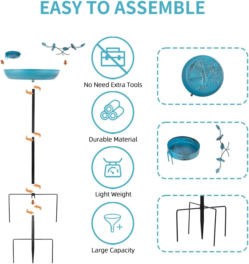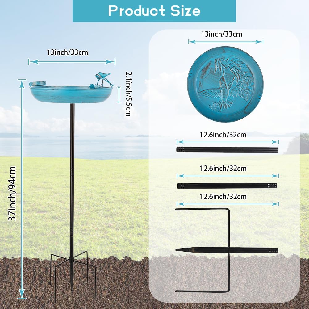 • Bird Bath Bowl: This blue bird bath measures 37 inches high X 13 inches diameter. Designed with hummingbird and flower patterns printed on the bowl bottom, and 2 metal birds standing on branches on the edge of the bird bath, making it easy to invite other birds to enjoy comfortable bathing time