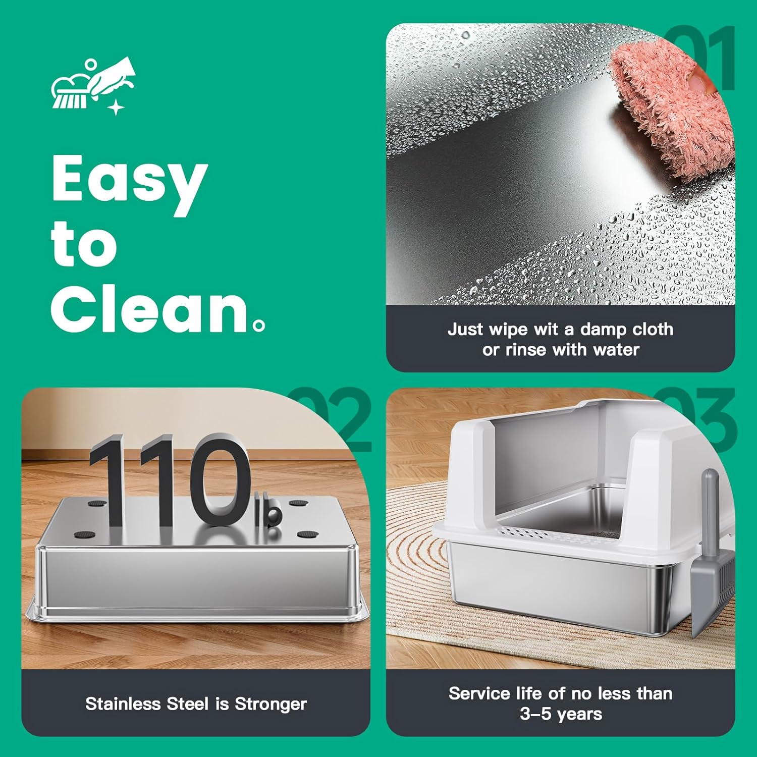 - 【EASY TO CLEAN】The unique metal material of the extra large stainless steel litter box covered is very easy to clean, just use a wet rag or rinse it to get it clean as new